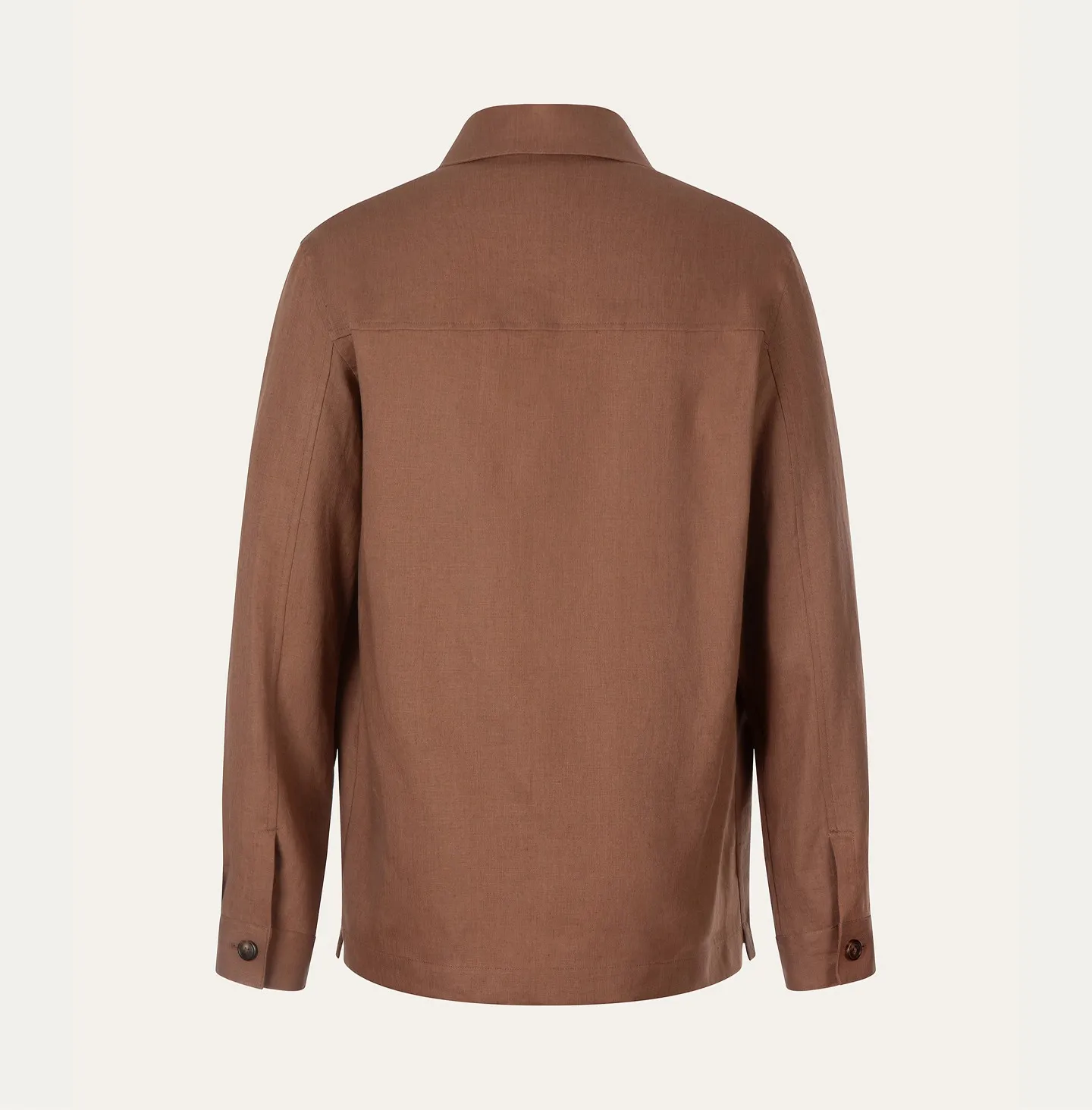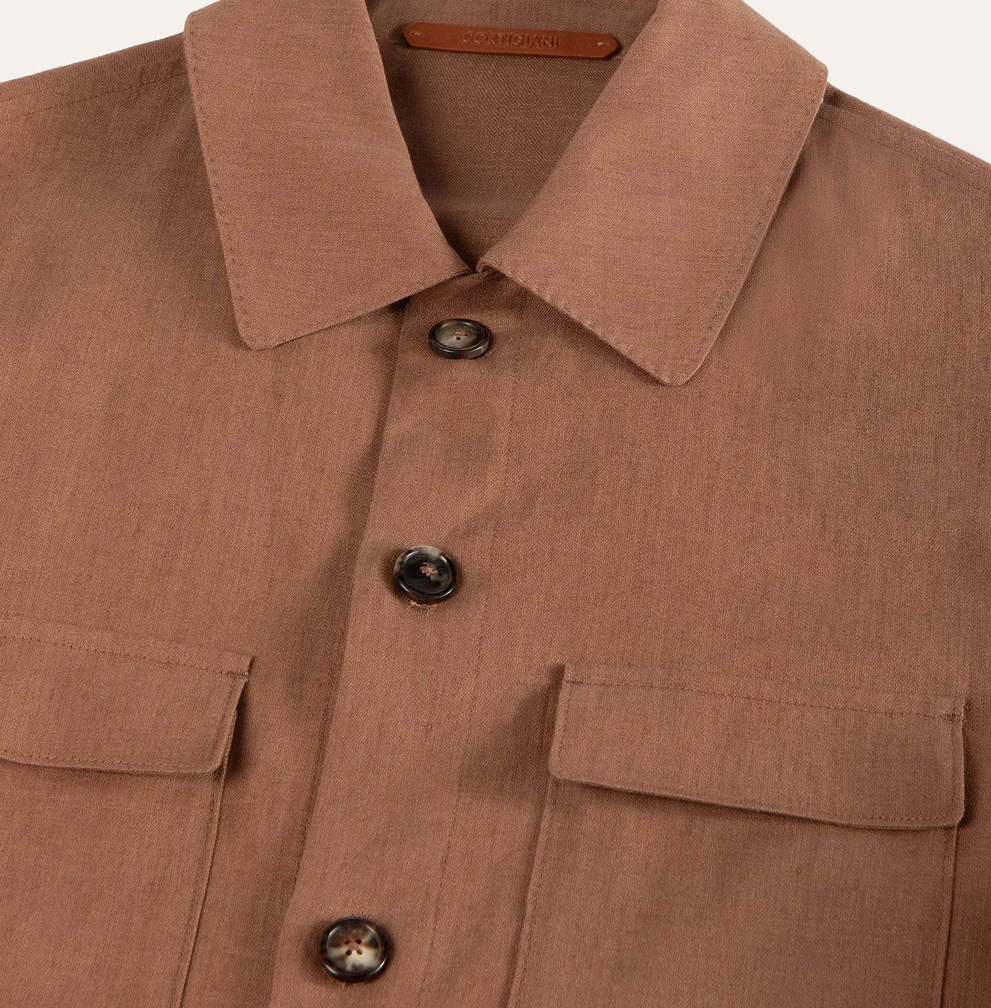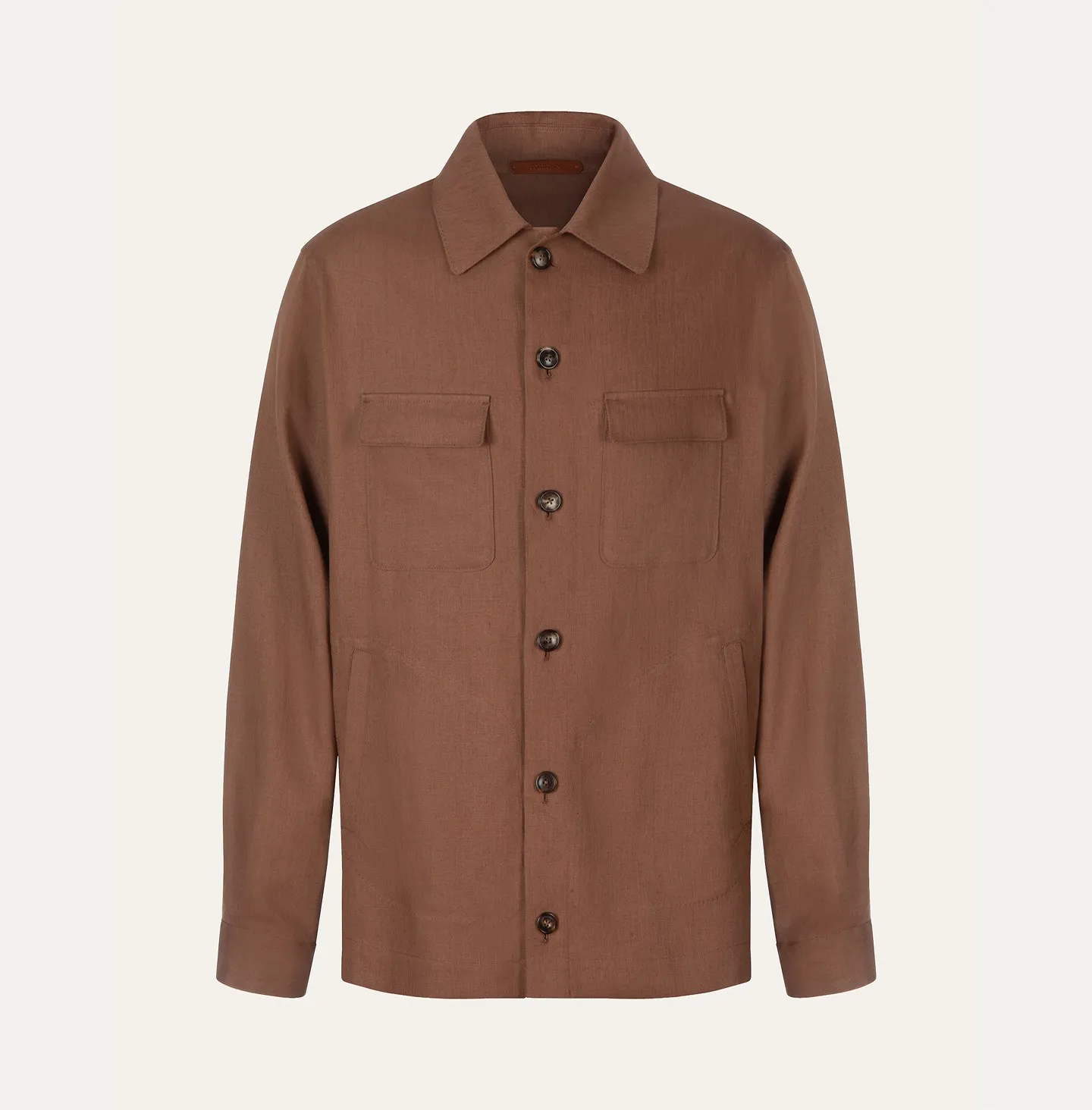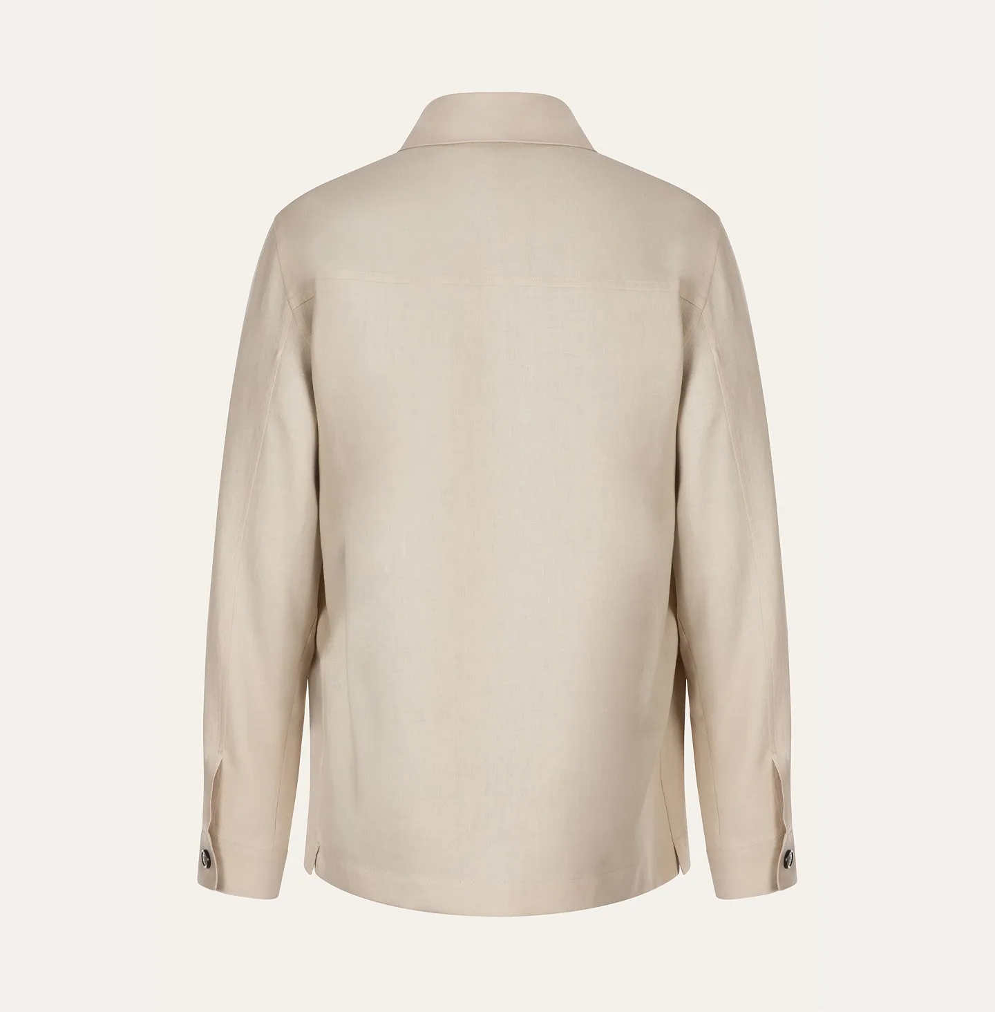 Shirt-style jacket defined by a clean, contemporary design and soft volumes that enhance its versatility. The classic collar, front button fastening and two flap patch pockets on the chest recall a refined utility inspiration. Side welt pockets and a straight hem complete the garment, balancing functionality and understated elegance. A lightweight and sophisticated piece, perfect for the spring and summer season.