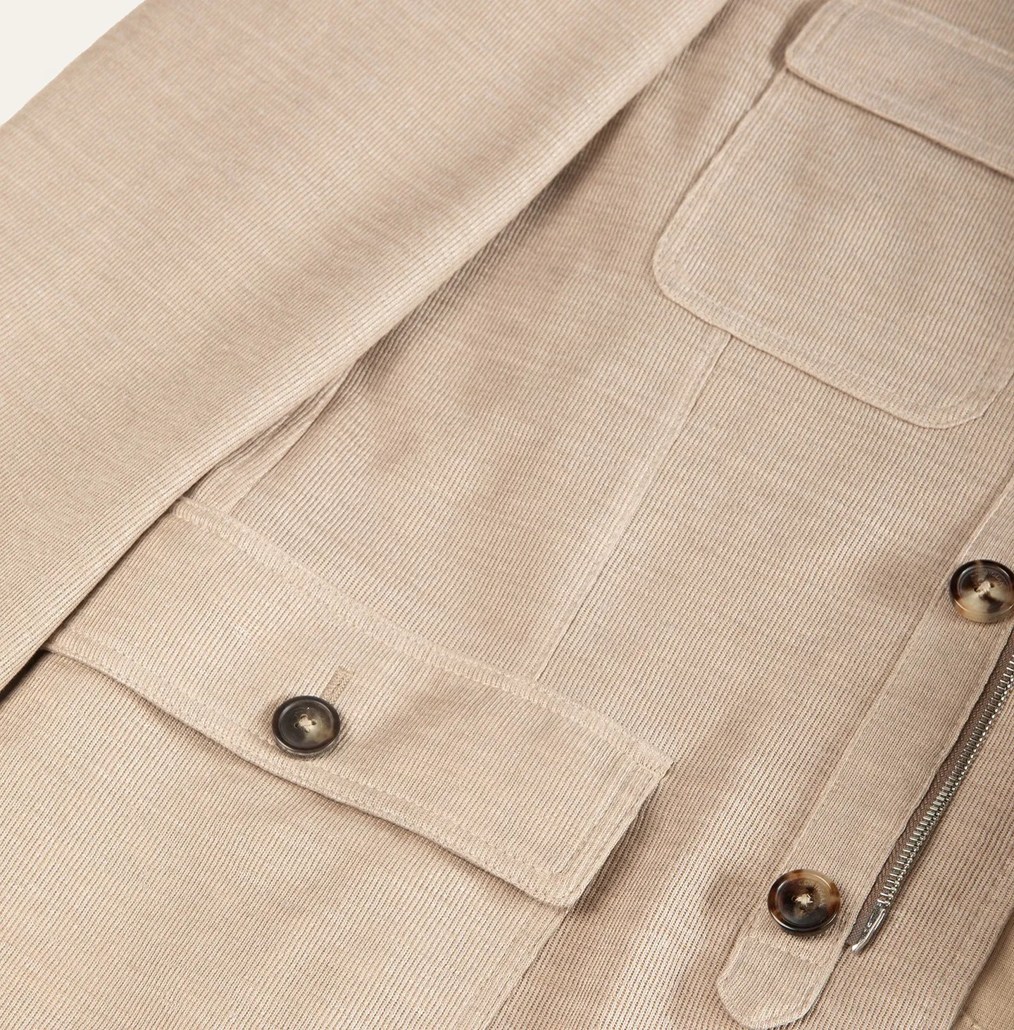 Safari-style outerwear with a clean, contemporary silhouette, featuring a stand collar with concealed fastening and inner zip closure. The design includes four flap patch pockets two on the chest and two lower pockets echoing iconic military heritage reinterpreted with refined elegance. The front button fastening and adjustable buttoned cuffs enhance both functionality and sophistication.