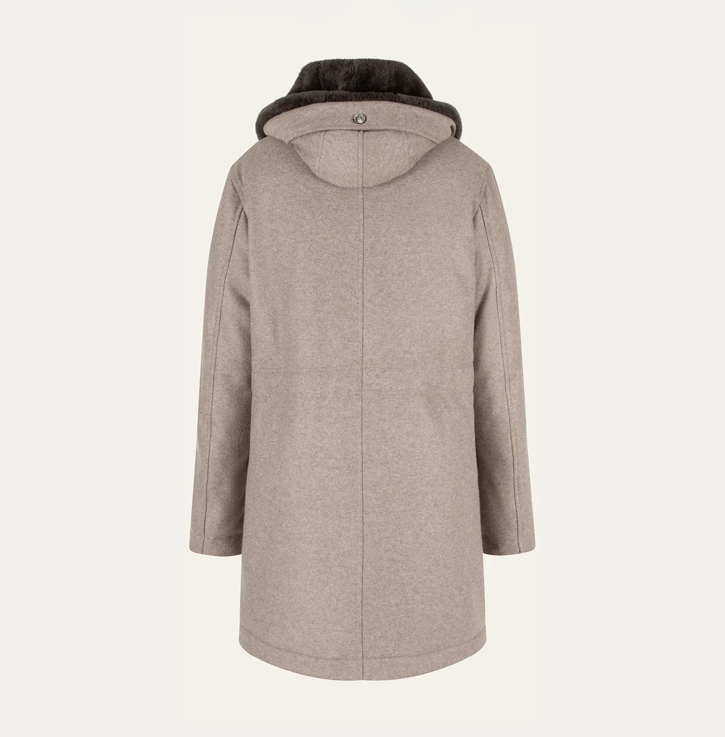A sophisticated and functional parka, defined by its clean design and slightly relaxed silhouette. The model features a shearling-lined collar and hood, adding a touch of refined elegance while ensuring maximum warmth and comfort. The patch pockets with flaps and buttons have a double entry, both front and side, combining practicality with style. A vertical chest pocket and a front closure with zip and visible buttons complete the piece, perfectly balancing aesthetics and functionality.