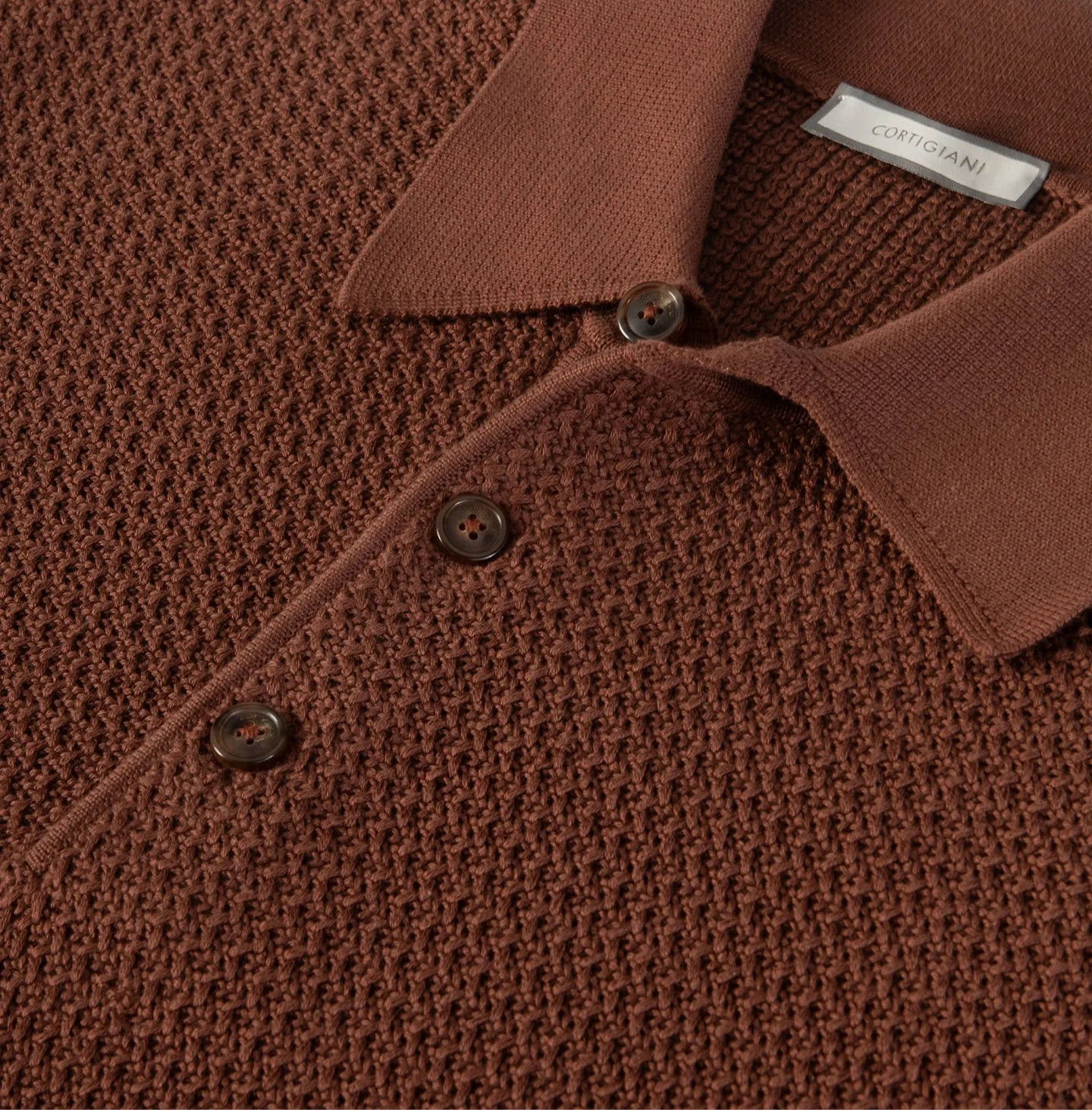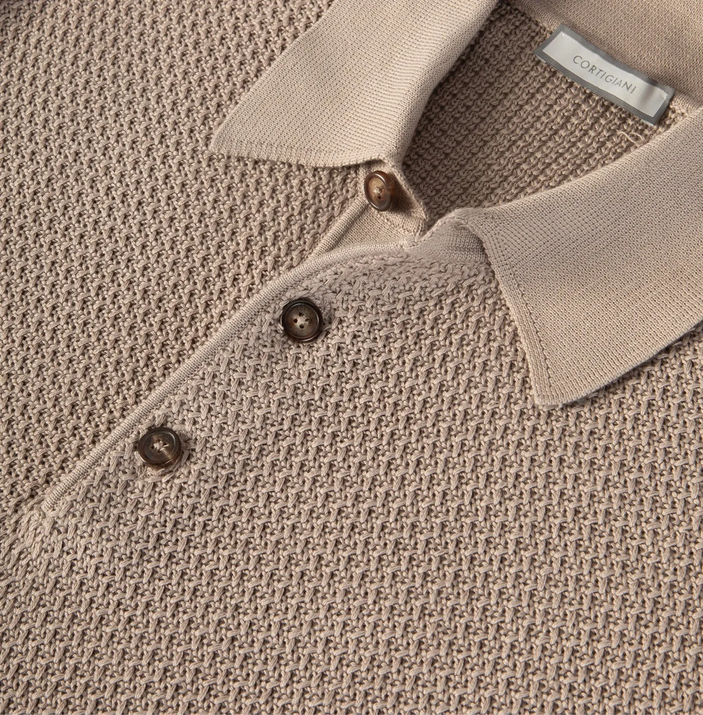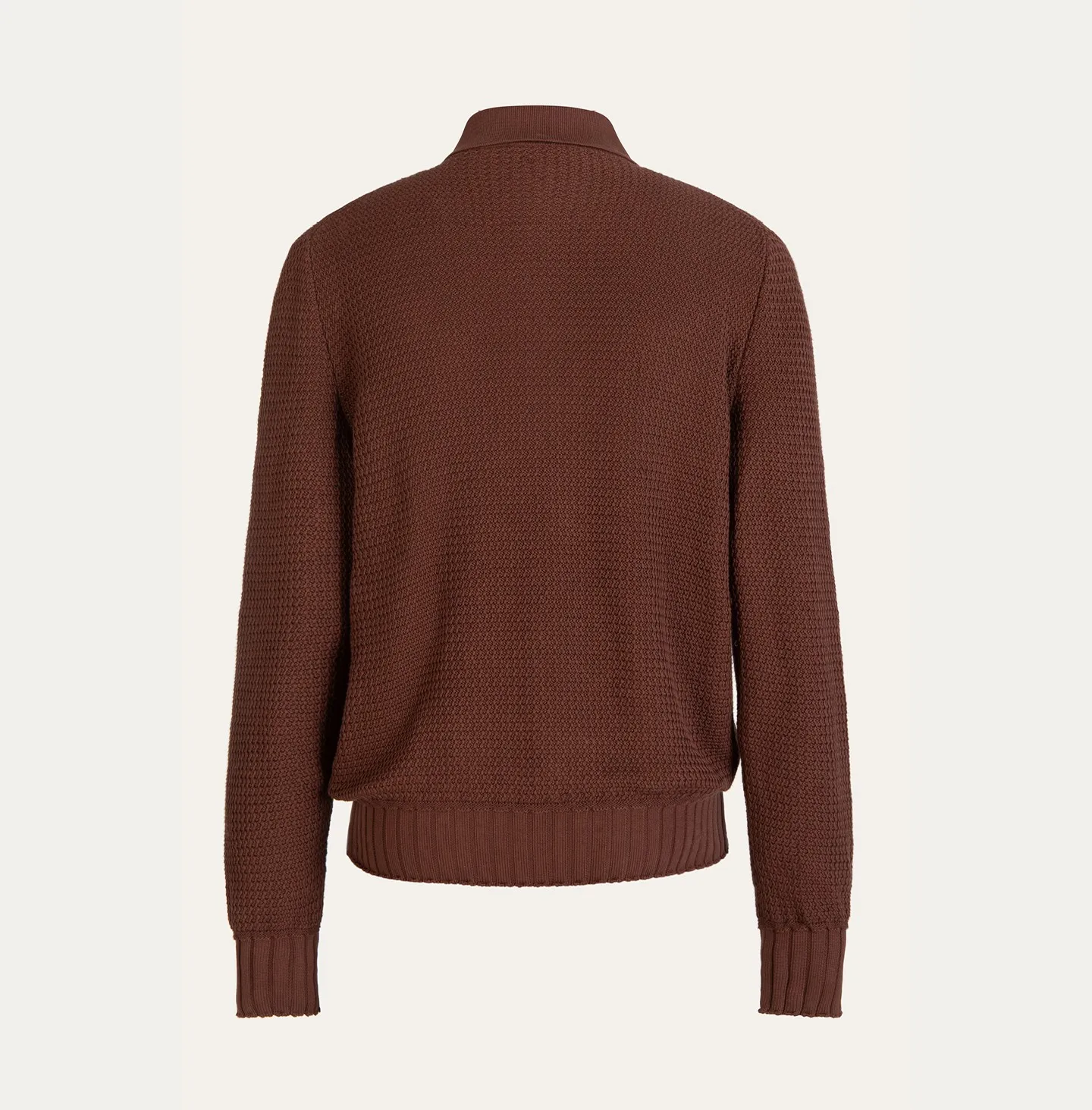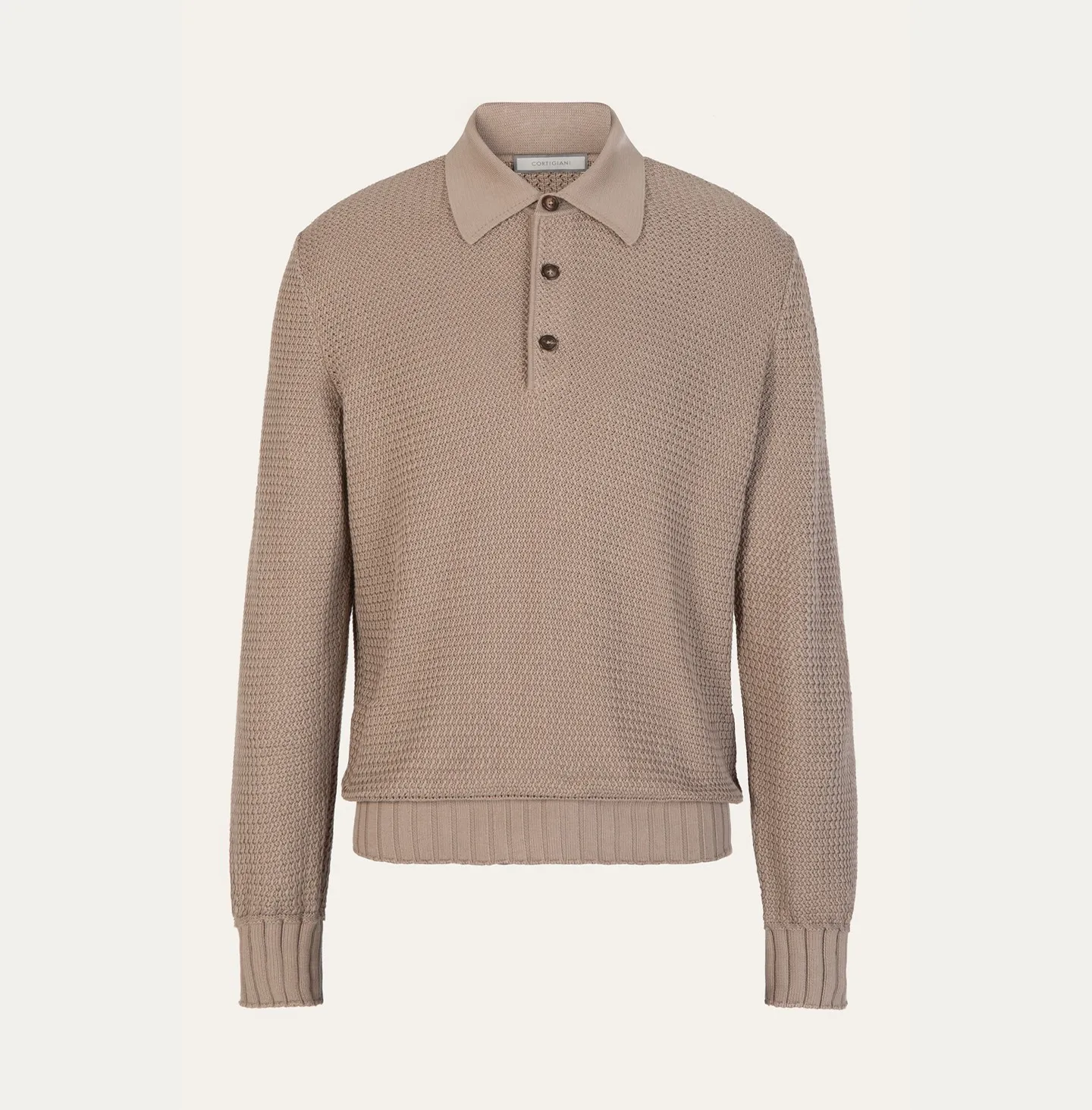 Long-sleeved polo shirt defined by a refined and contemporary aesthetic, enhanced by a cable knit structure that adds depth and visual richness to the surface. The design combines elegance and comfort through carefully considered details: the collar is precisely shaped to ensure a natural fit and a clean line around the neck, while the three-button placket maintains a classic and versatile look. The sleeves and hem are finished with a wide ribbed band, providing structure and stability while creating a balanced contrast with the textured body of the garment.