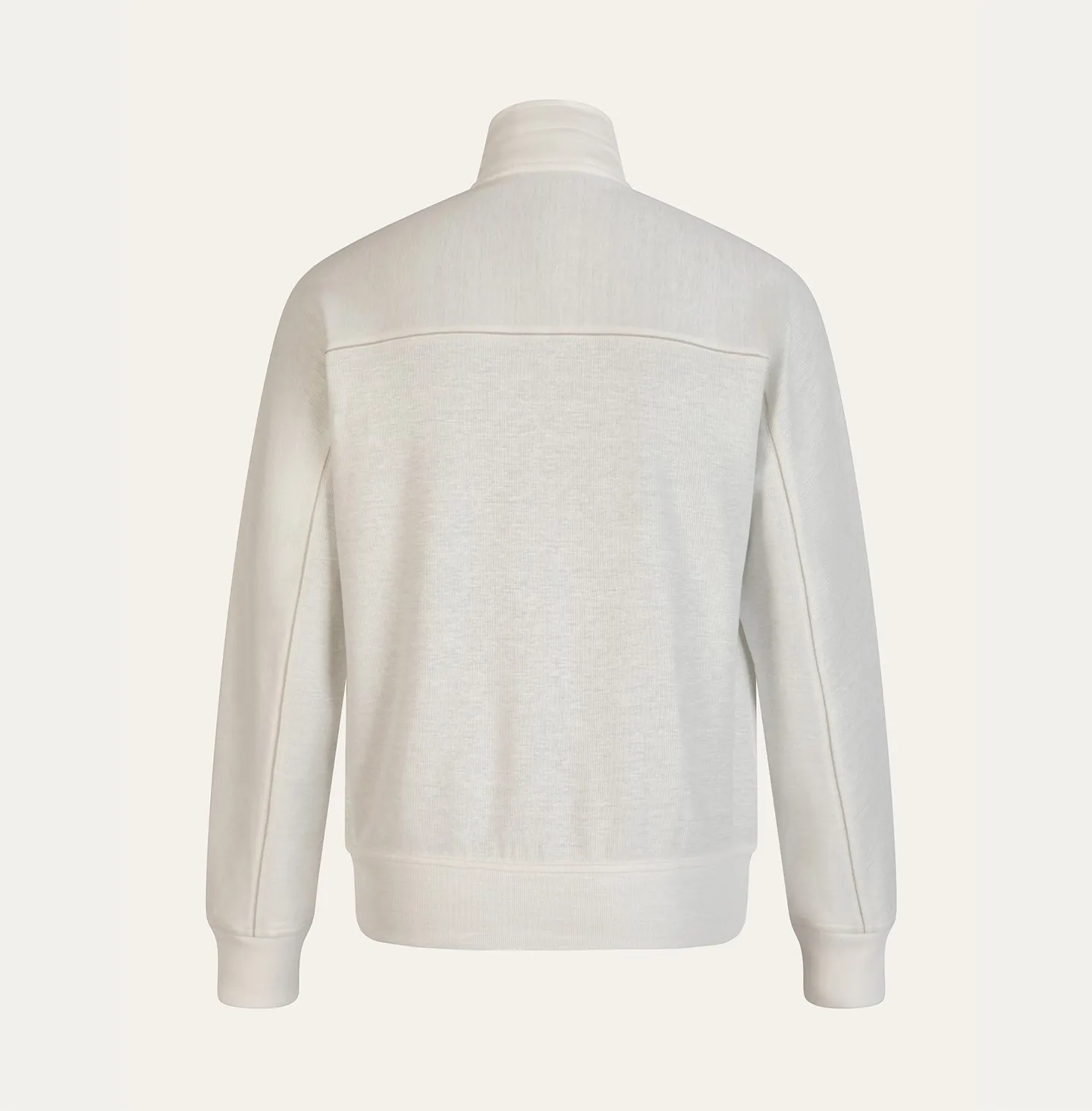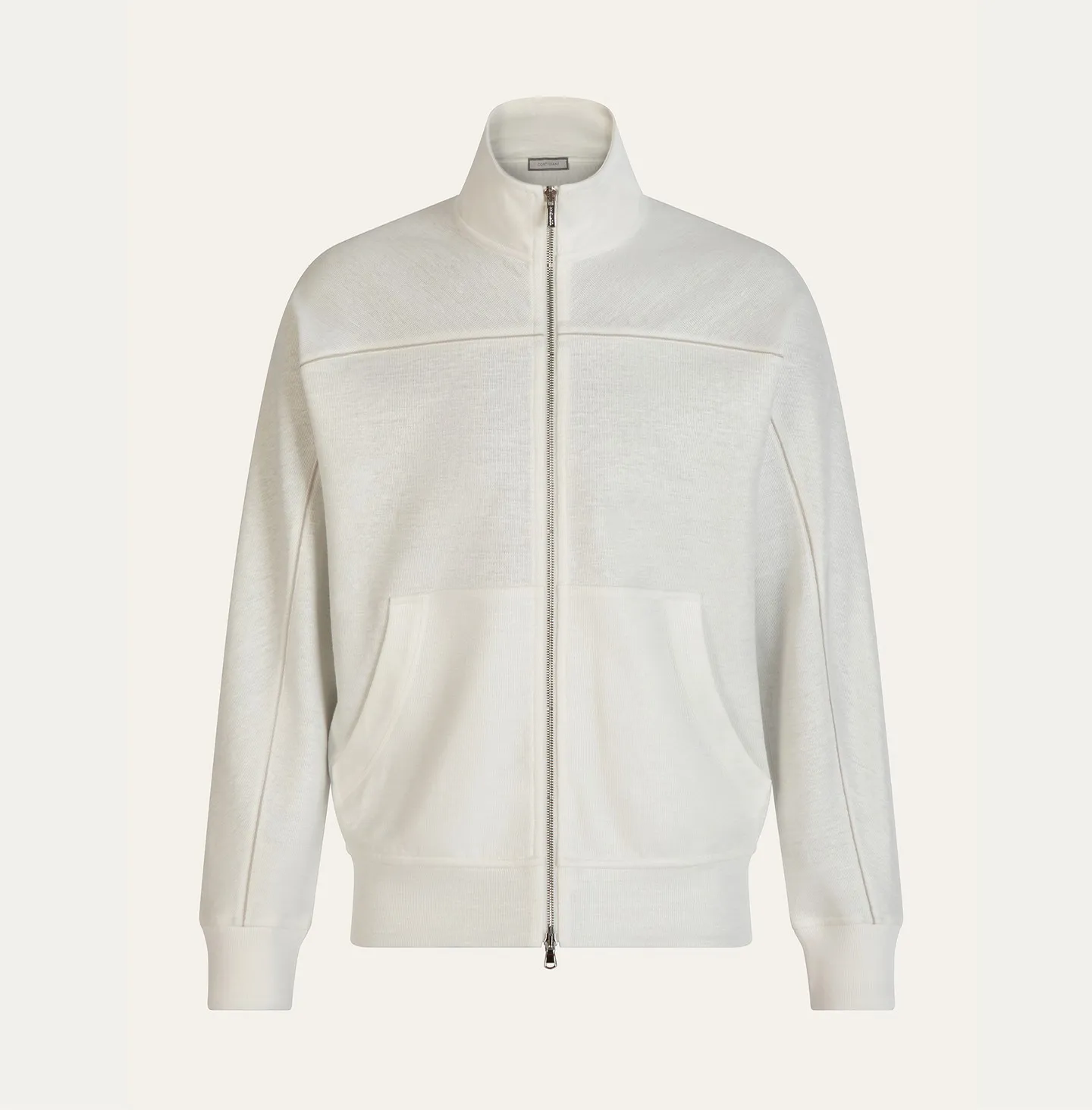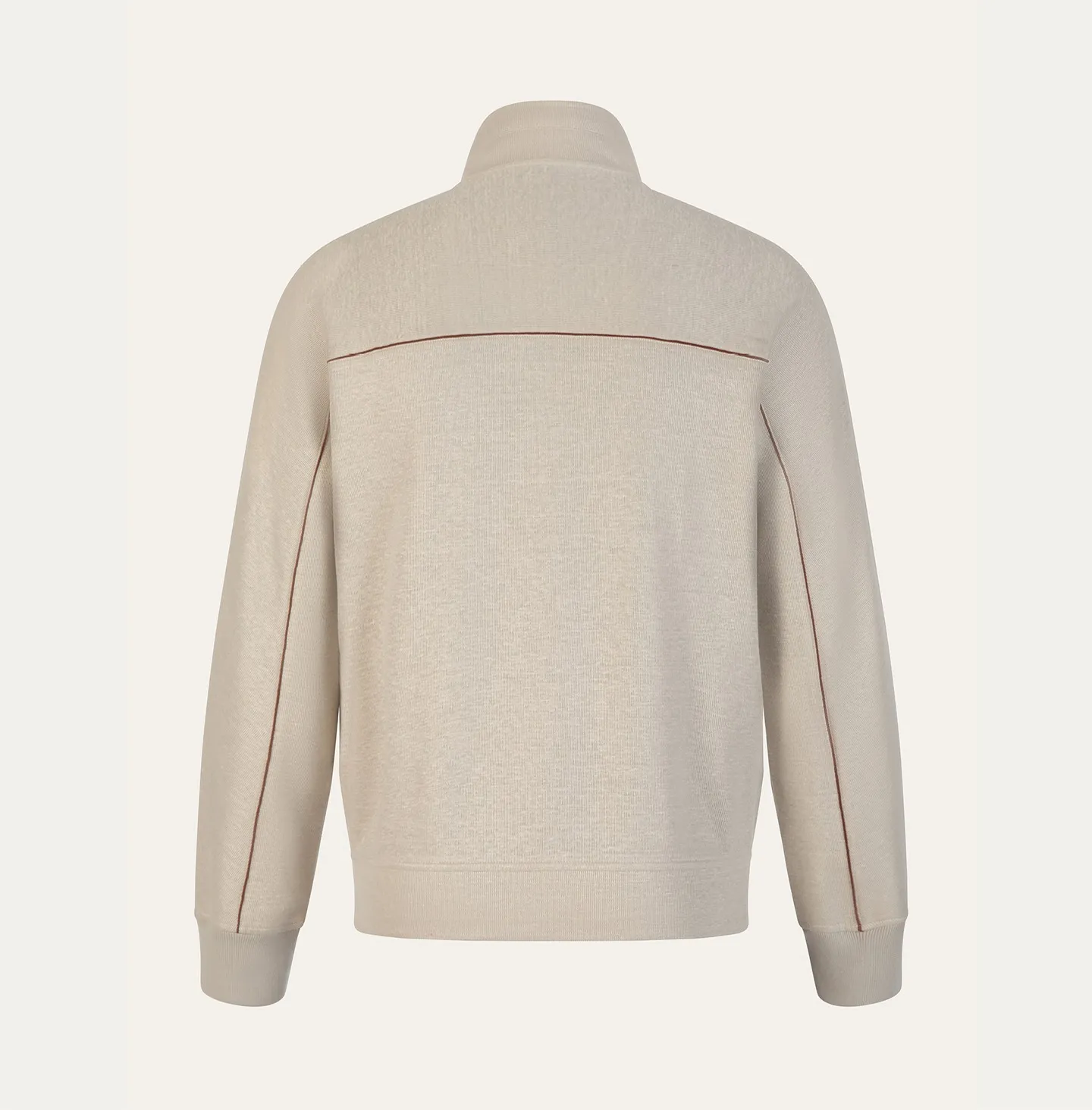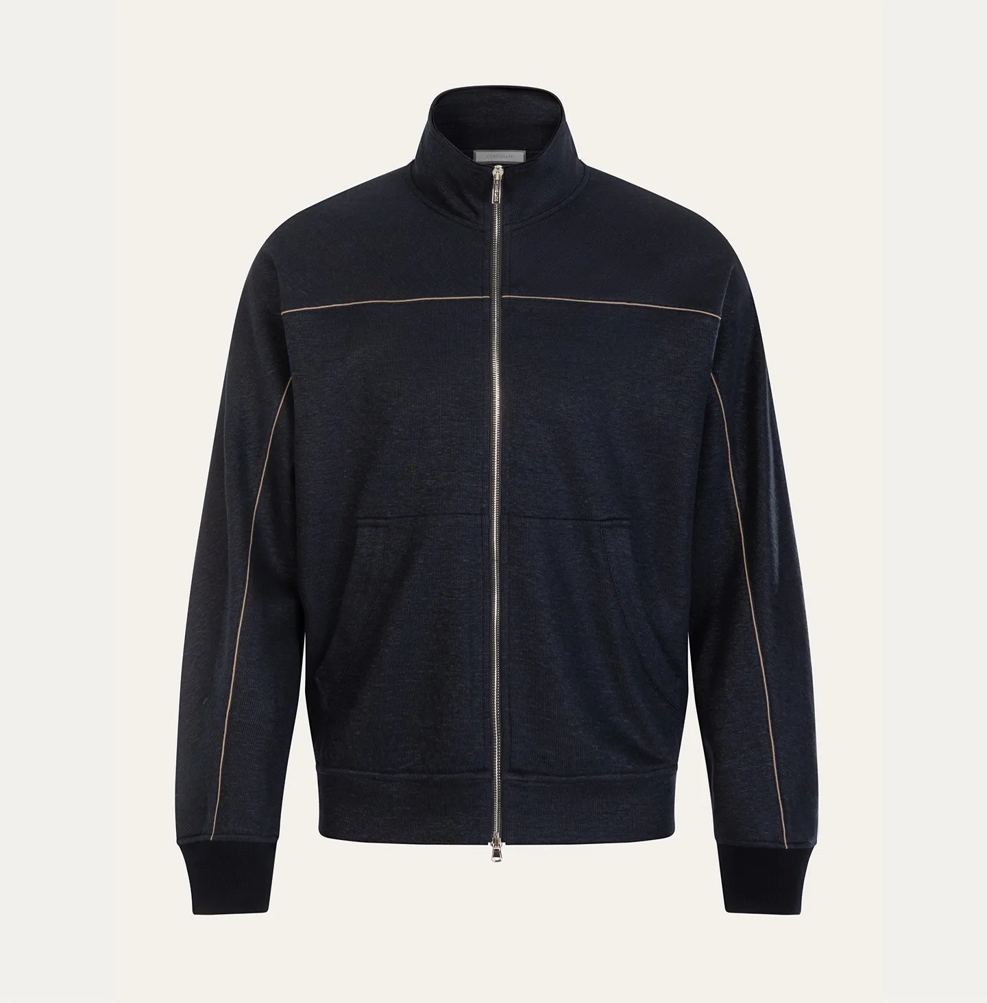A zip-front topwear piece with a high collar, defined by a clean and contemporary aesthetic that combines comfort with understated refinement. The design features a streamlined silhouette with soft shoulders and ribbed cuffs and hem, elements that recall classic sportswear while being reinterpreted in a more sophisticated way. The double-slider zip closure and pockets add functionality and practicality to the garment. A distinctive detail is the contrasting piping that runs across the chest and along the sleeves, creating a subtle graphic line that enhances the construction of the piece and adds a refined touch of character.
