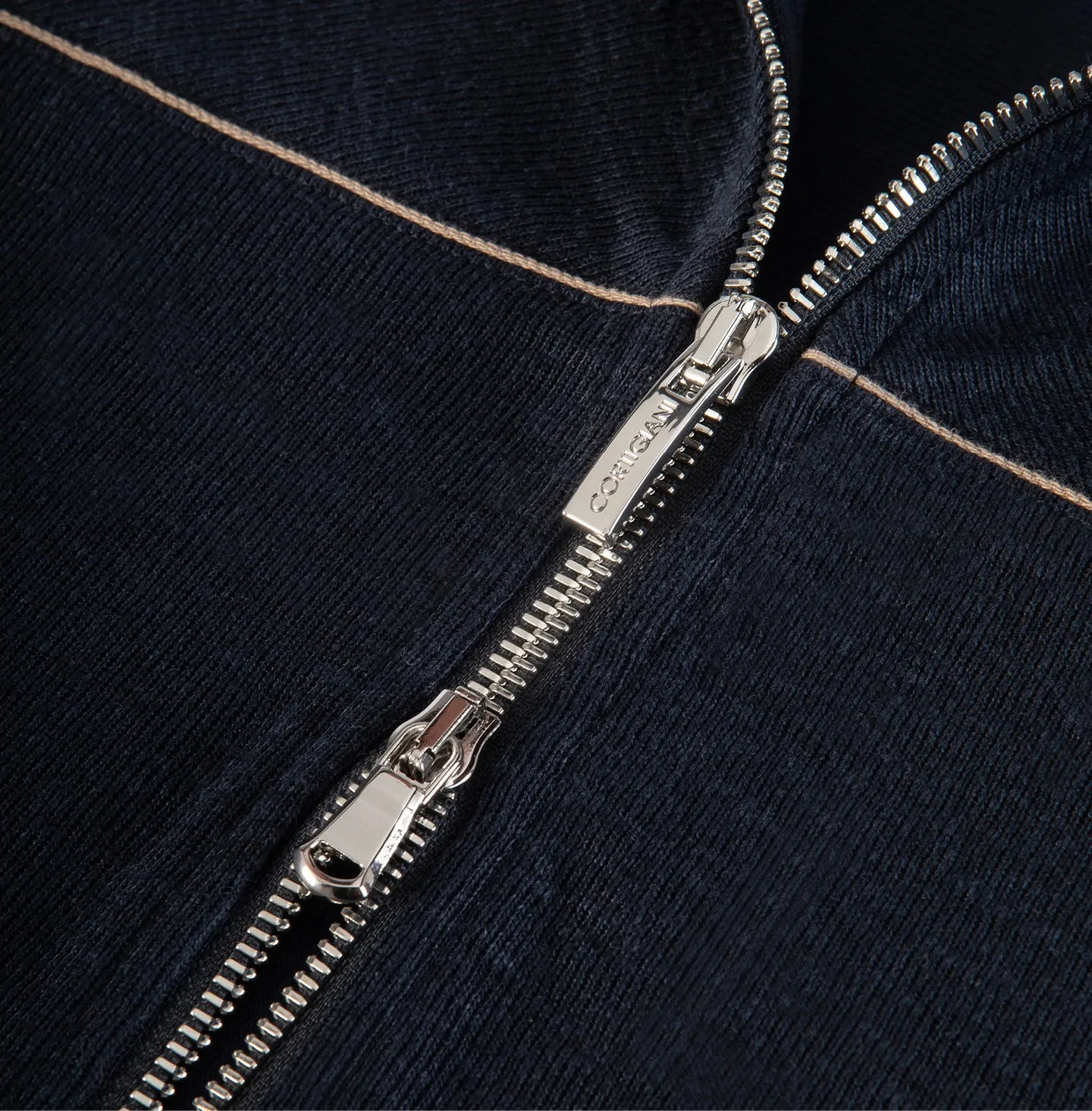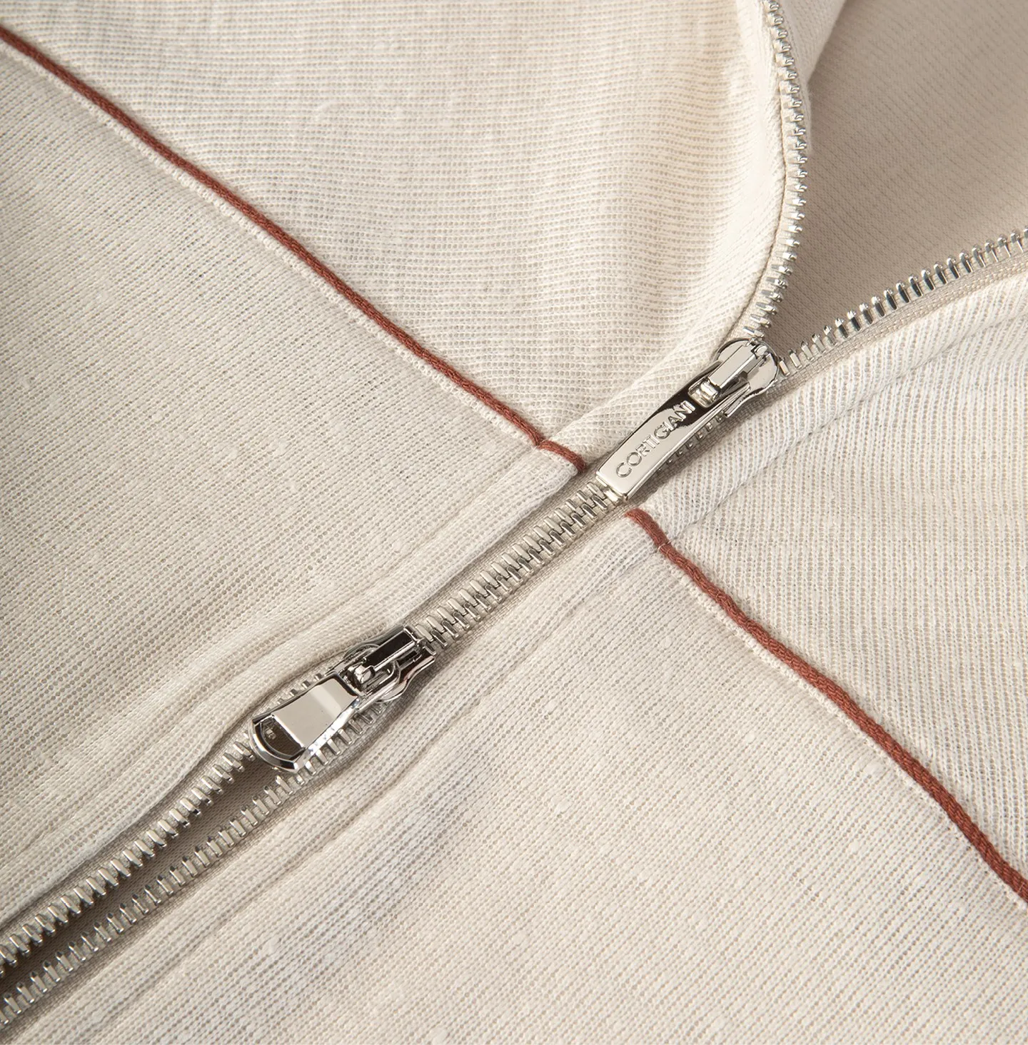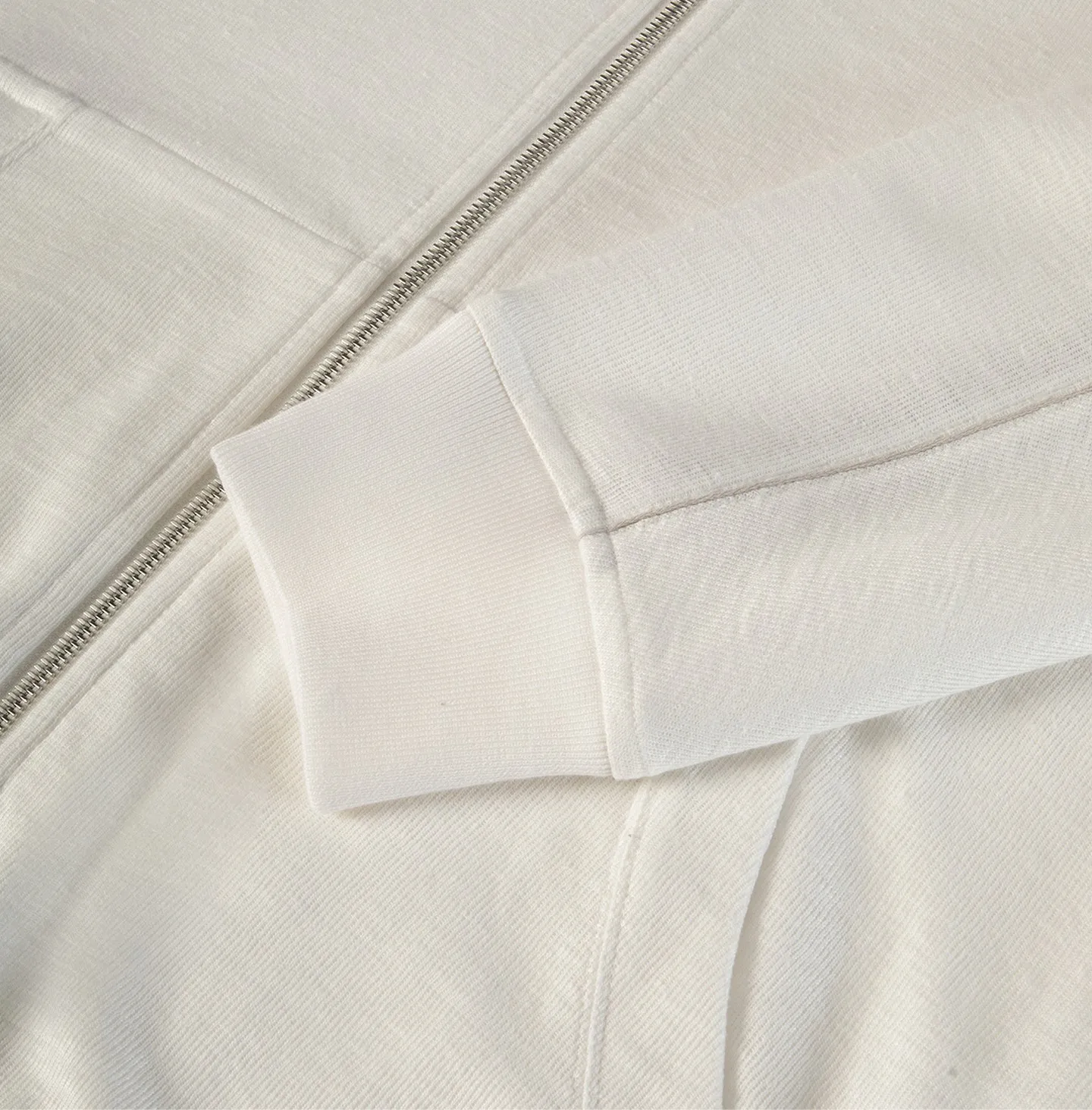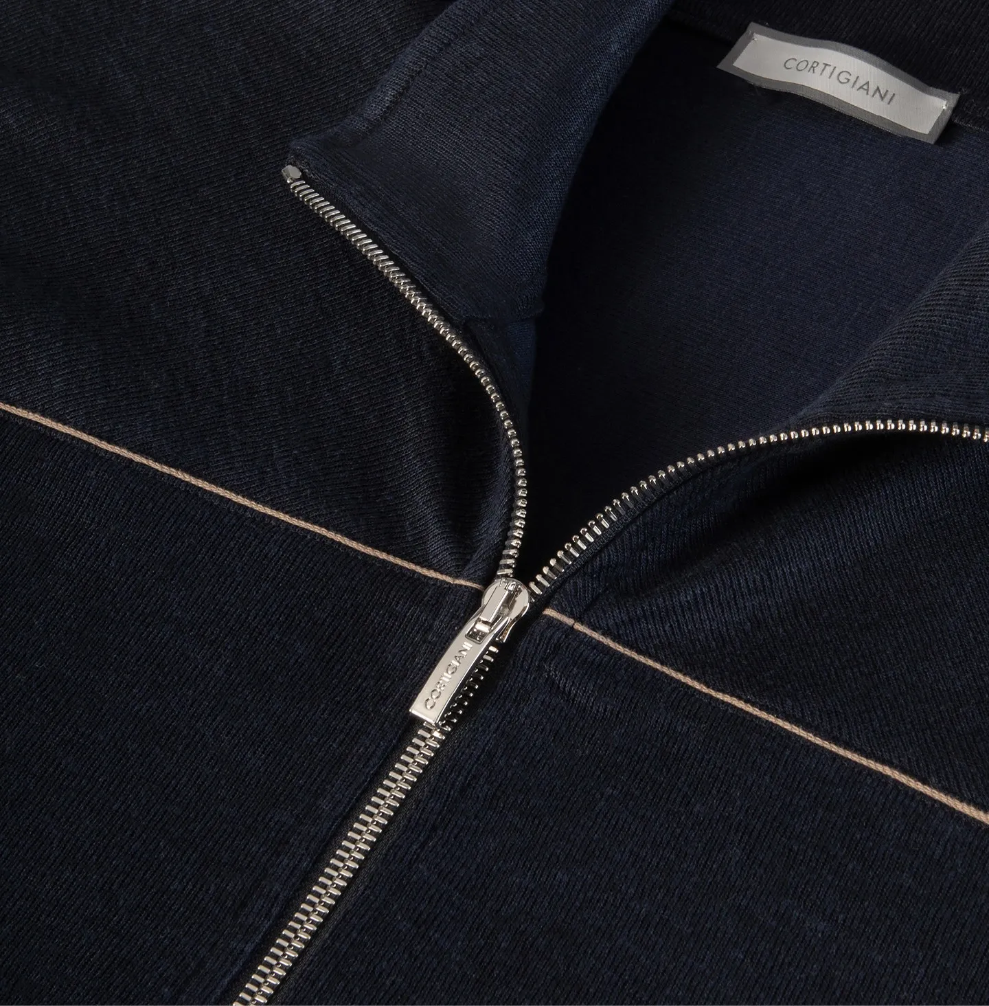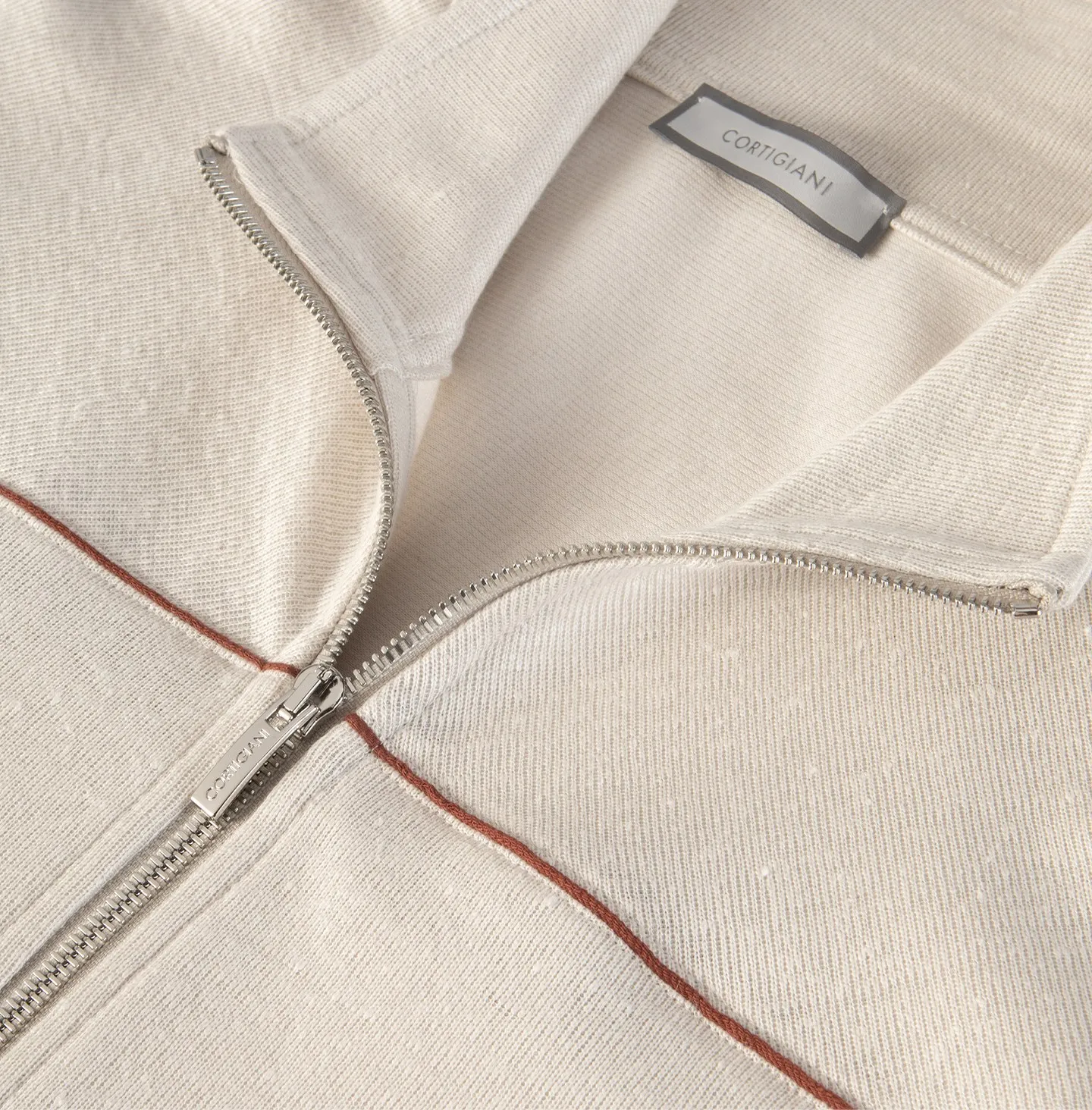 A zip-front topwear piece with a high collar, defined by a clean and contemporary aesthetic that combines comfort with understated refinement. The design features a streamlined silhouette with soft shoulders and ribbed cuffs and hem, elements that recall classic sportswear while being reinterpreted in a more sophisticated way. The double-slider zip closure and pockets add functionality and practicality to the garment. A distinctive detail is the contrasting piping that runs across the chest and along the sleeves, creating a subtle graphic line that enhances the construction of the piece and adds a refined touch of character.