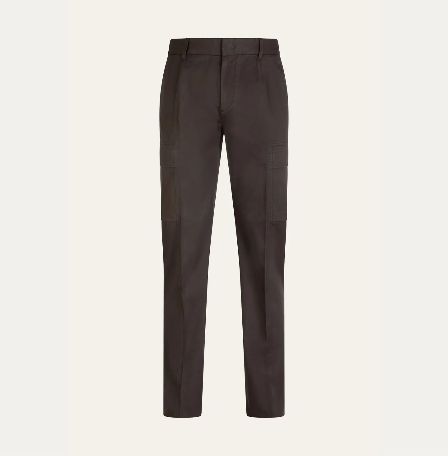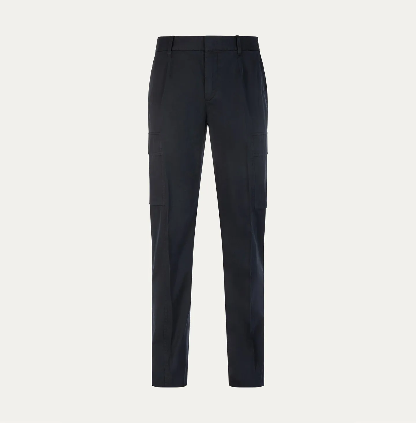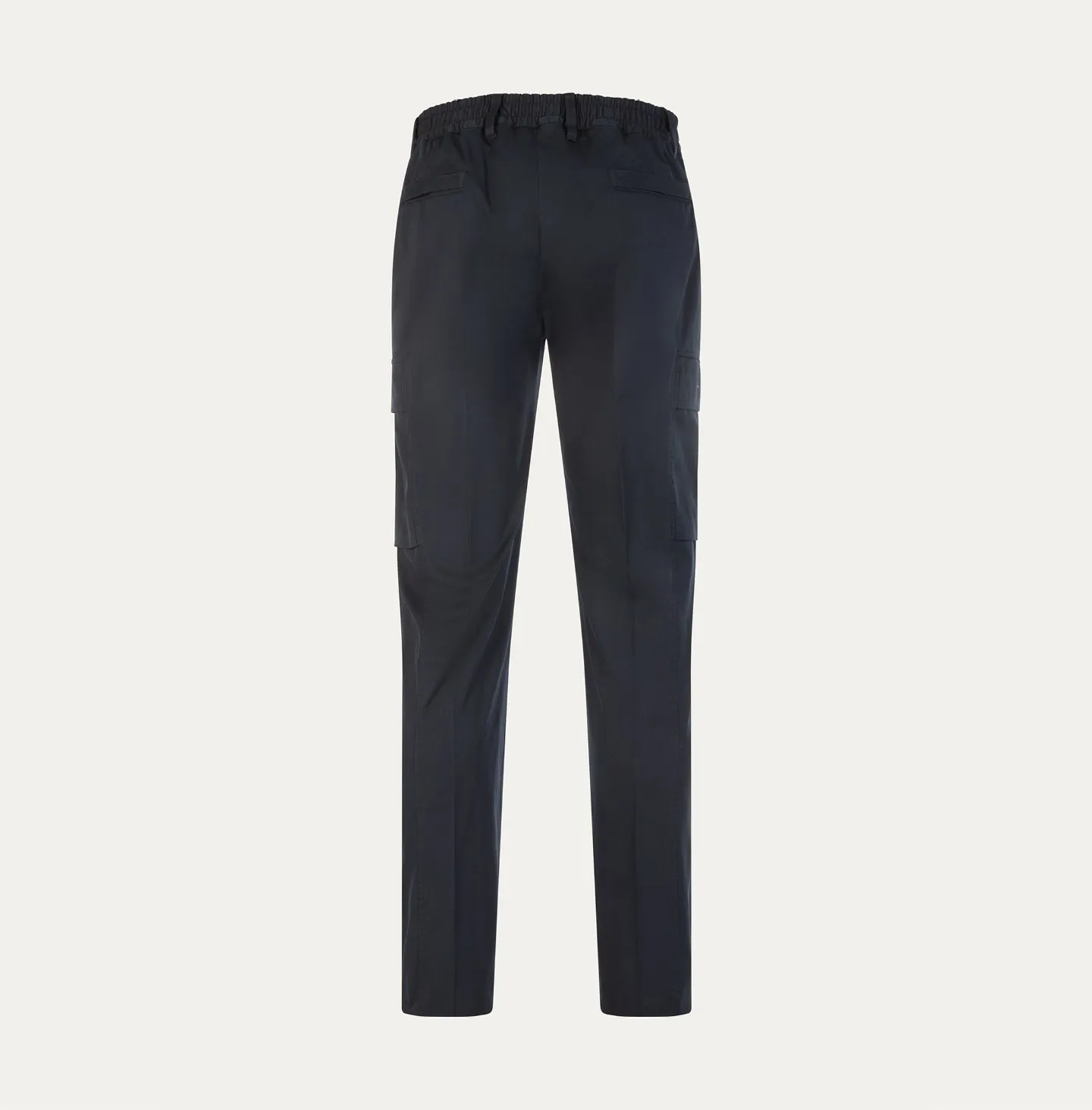 A contemporary reinterpretation of the classic cargo trouser, defined by clean lines and a refined, understated aesthetic. The design features a waistband with belt loops and an elasticated back, ensuring comfort and a more flexible fit while maintaining a polished appearance. Slanted side pockets and rear welt pockets complete the construction. The distinctive element of the style lies in the side cargo pockets with flaps integrated into the side seams, a subtle detail that incorporates the functionality of cargo trousers in a discreet and elegant way while preserving a streamlined, modern silhouette.