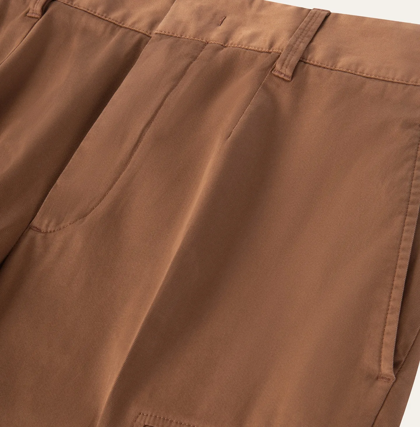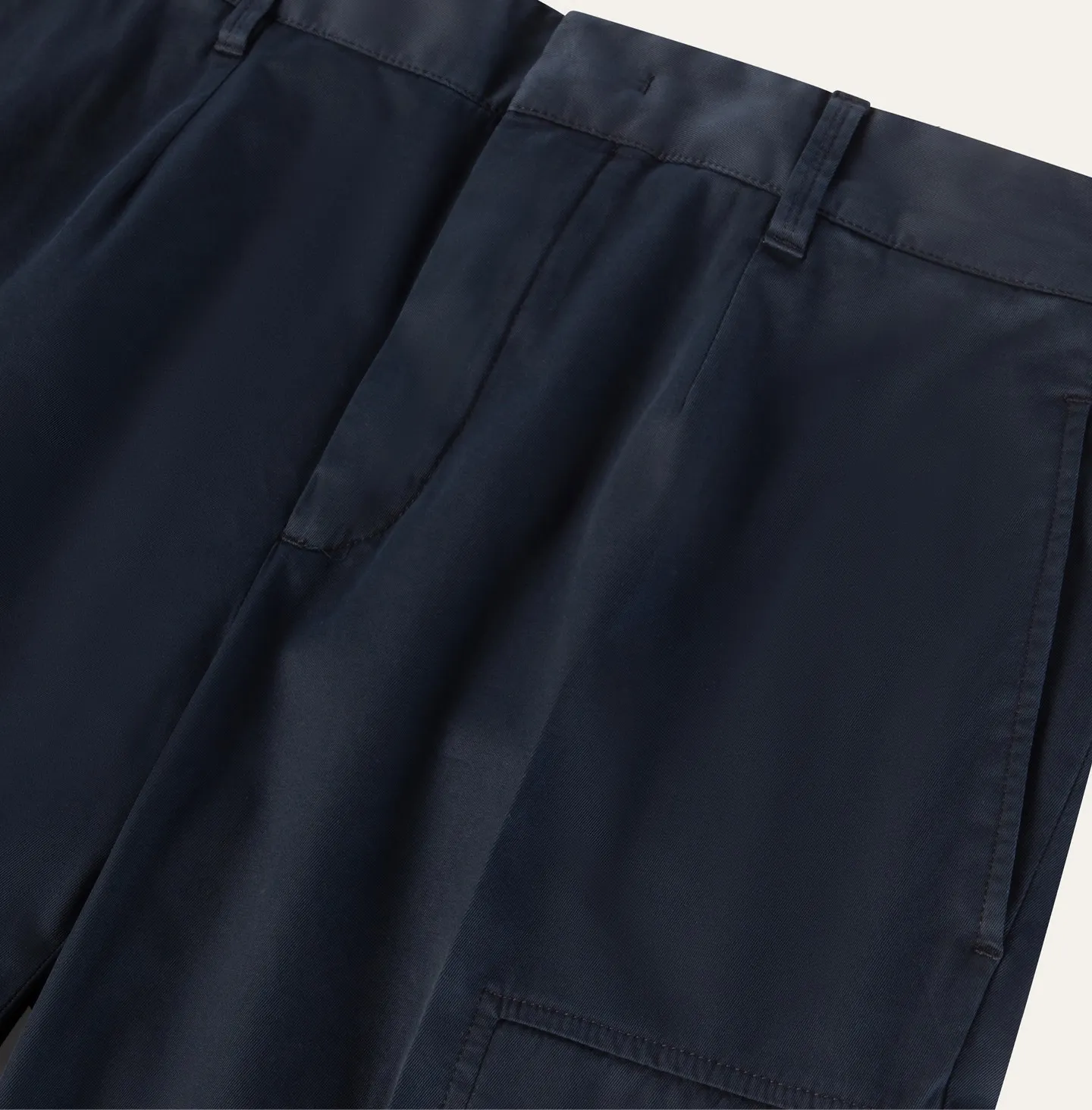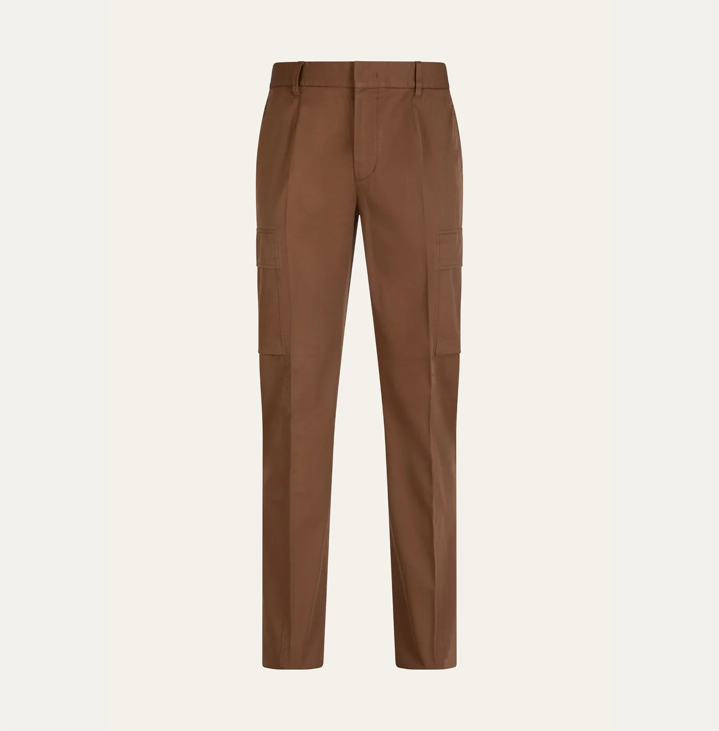 A contemporary reinterpretation of the classic cargo trouser, defined by clean lines and a refined, understated aesthetic. The design features a waistband with belt loops and an elasticated back, ensuring comfort and a more flexible fit while maintaining a polished appearance. Slanted side pockets and rear welt pockets complete the construction. The distinctive element of the style lies in the side cargo pockets with flaps integrated into the side seams, a subtle detail that incorporates the functionality of cargo trousers in a discreet and elegant way while preserving a streamlined, modern silhouette.