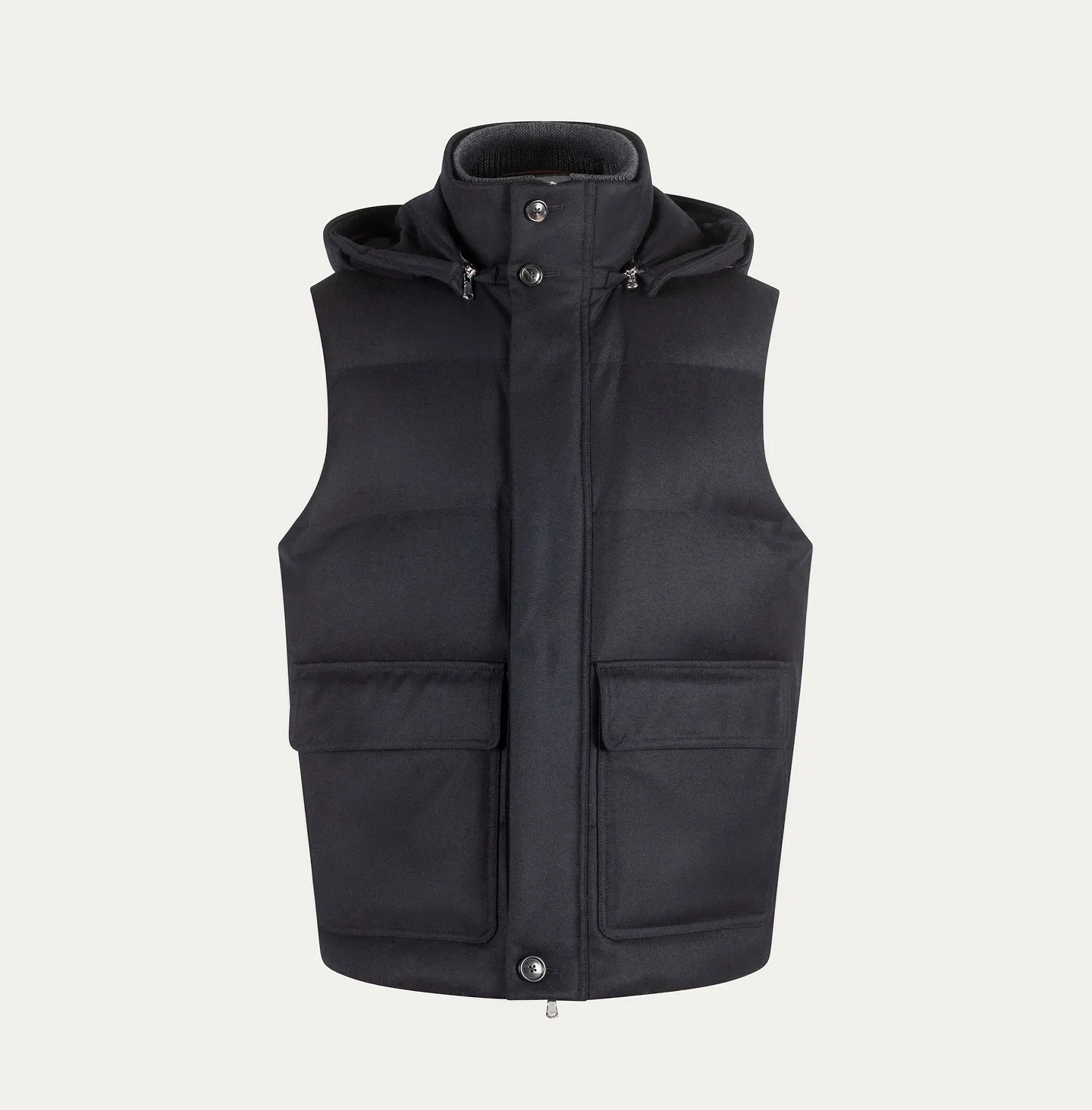 This sleeveless down jacket combines the practicality of a sporty piece with the understated elegance of refined materials. The clean design is enhanced by the detachable hood and removable knit collar, allowing for style and functionality to be adjusted as needed. Front flap pockets and the central double-slider zip with snap buttons ensure comfort and protection. A versatile piece, perfect for leisure moments with a contemporary and refined touch.