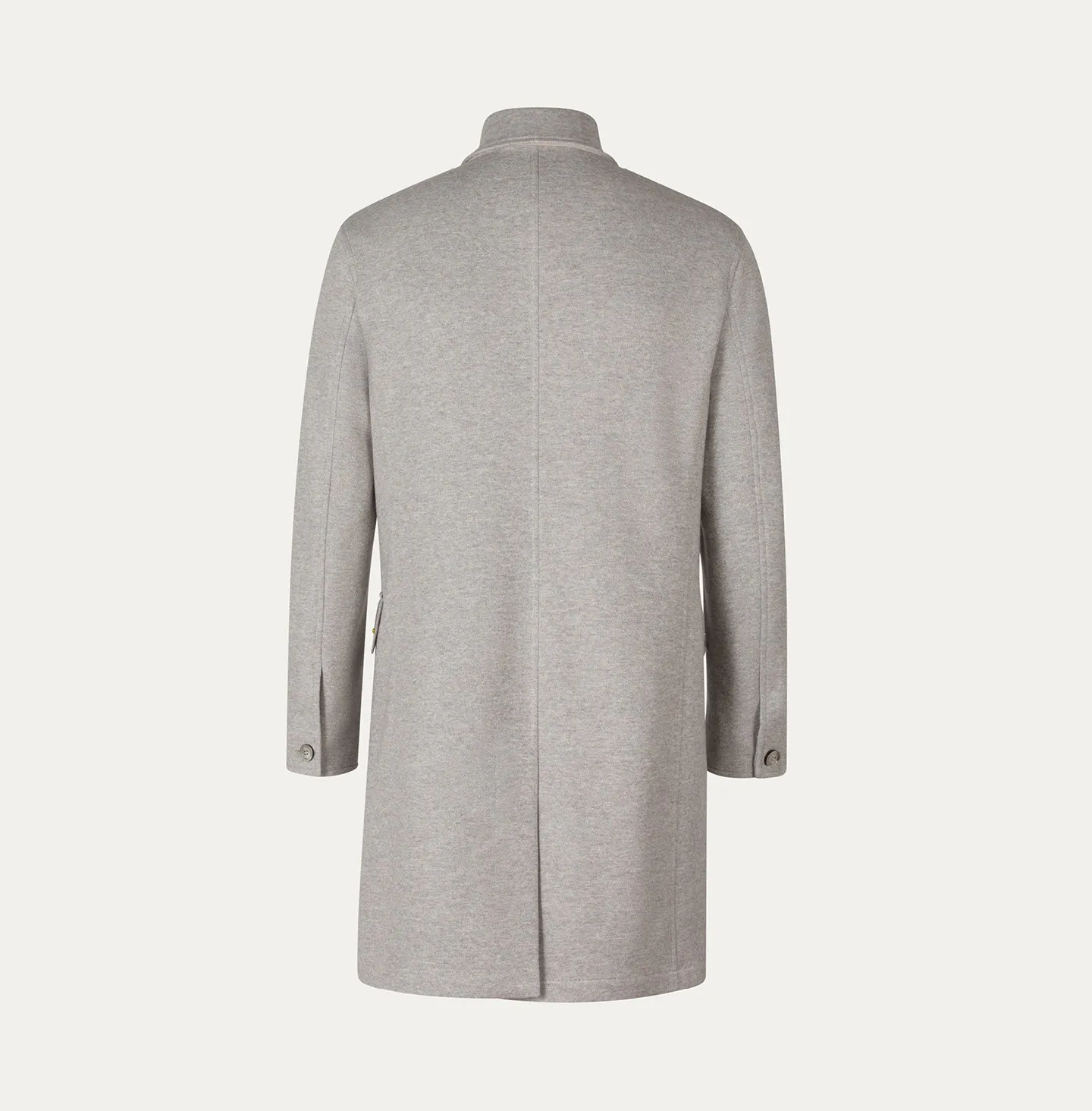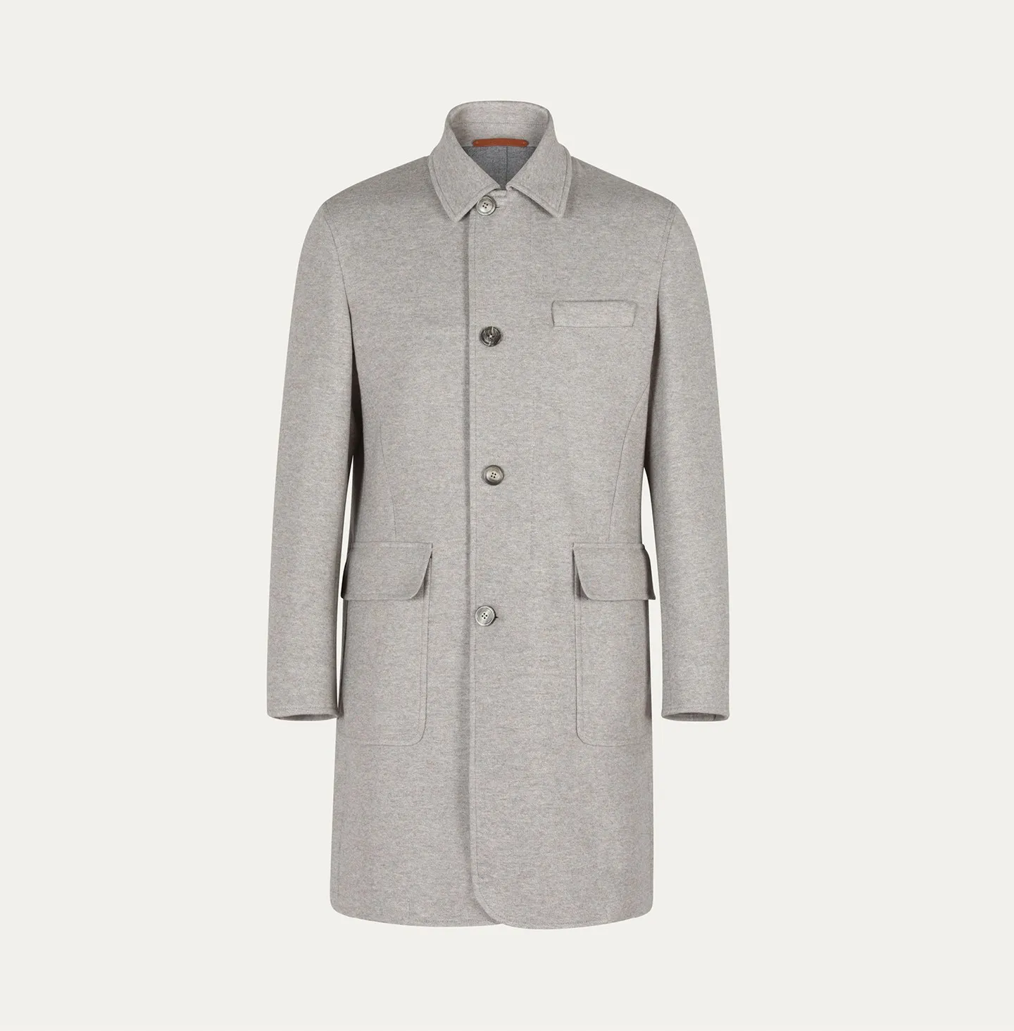 This classic coat is reinterpreted in a contemporary key with clean lines and a double-faced construction that provides lightness and versatility. The design features a traditional collar, front button closure, and flap pockets enriched with a refined leather detail hidden beneath the flap. Its essential structure and carefully crafted details make it the perfect piece to complete both formal and casual looks with the same sophistication.