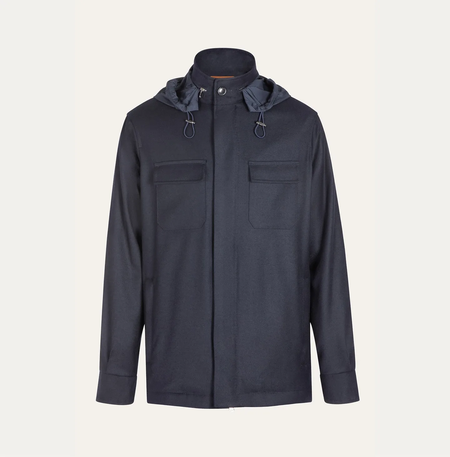 Outerwear in a shirt-inspired design, featuring clean lines and a versatile silhouette. The model is enhanced by a practical hood in nylon, which can be concealed inside the collar when not in use. The interior is finished with a quilted lining, offering both warmth and lightness. The two flap pockets on the chest, along with the concealed front fastening, add a touch of functional elegance.