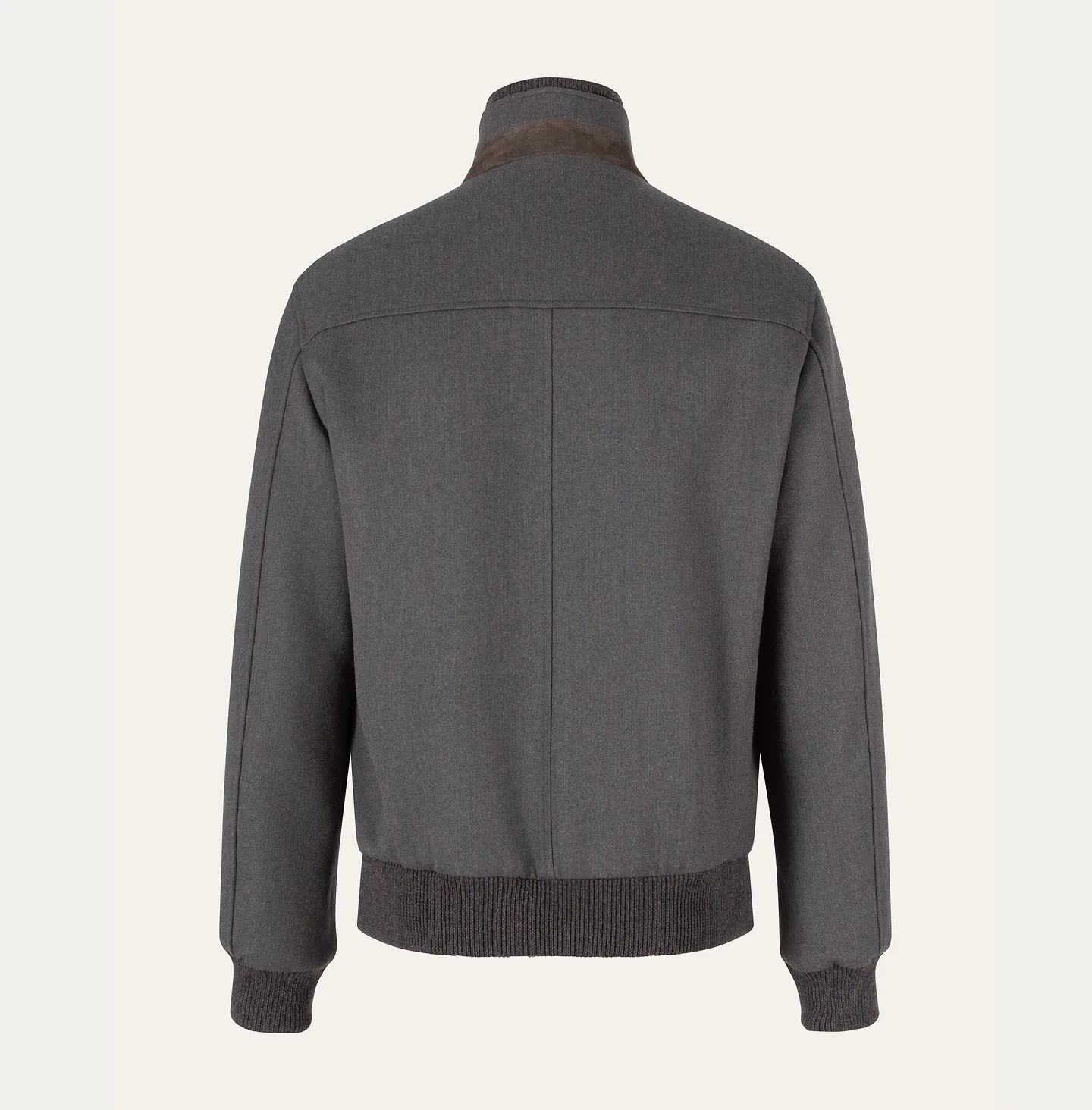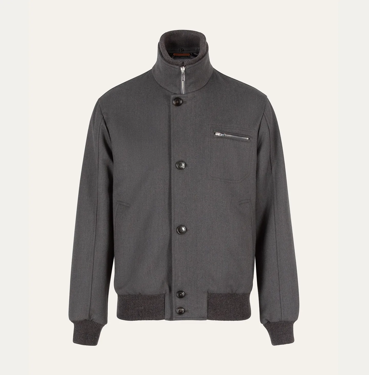 A sporty yet sophisticated bomber jacket, defined by clean lines and refined tailoring details. The model features a high knitted collar with a zip and button closure, adding a functional and contemporary touch. Sartorially crafted slanted side pockets and a front chest pocket with a metal zip complete the design, while the ribbed cuffs and hem ensure a comfortable fit and a balanced silhouette.