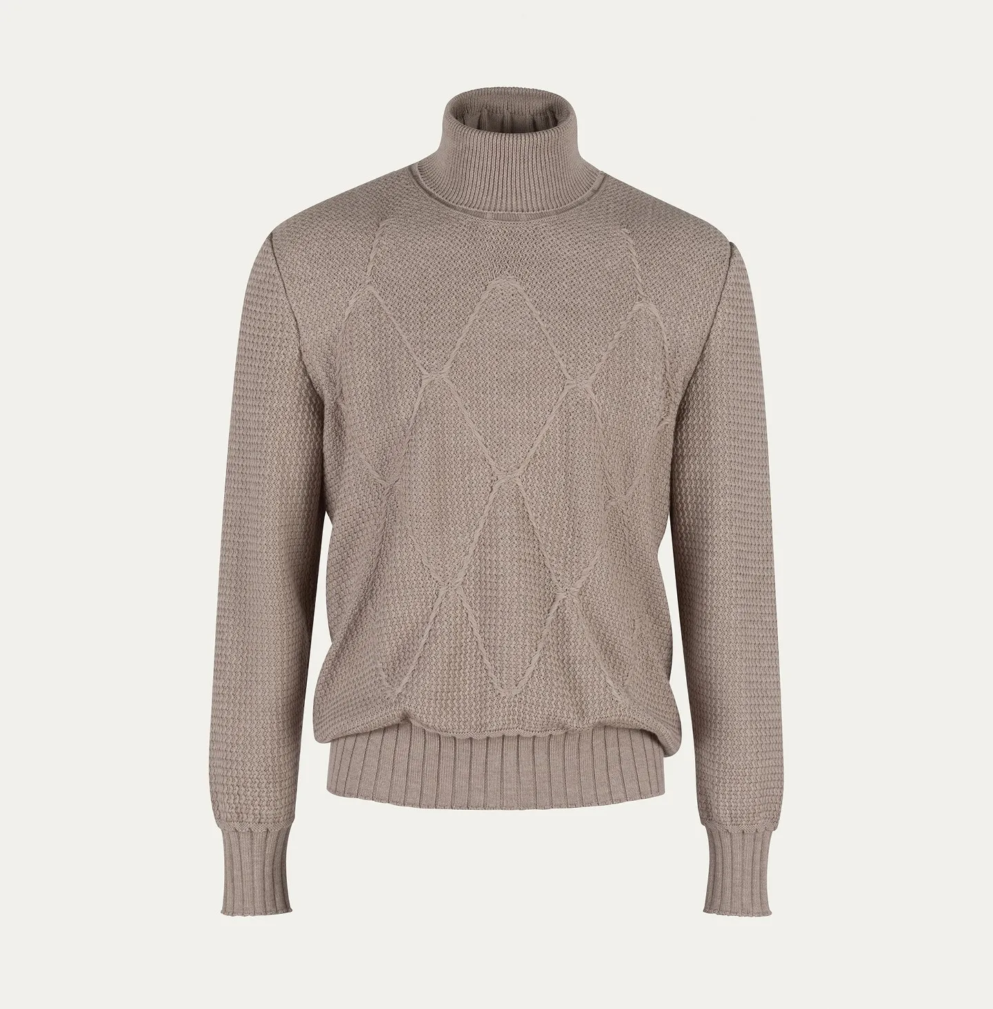 Turtleneck sweater crafted from a refined wool and cashmere yarn, combining softness and warmth in an elegant piece. The jacquard diamond pattern on the front is paired with a honeycomb structure on the sleeves and back, creating a sophisticated play of textures. Ribbed collar, cuffs, and hem provide comfort and a perfect fit.