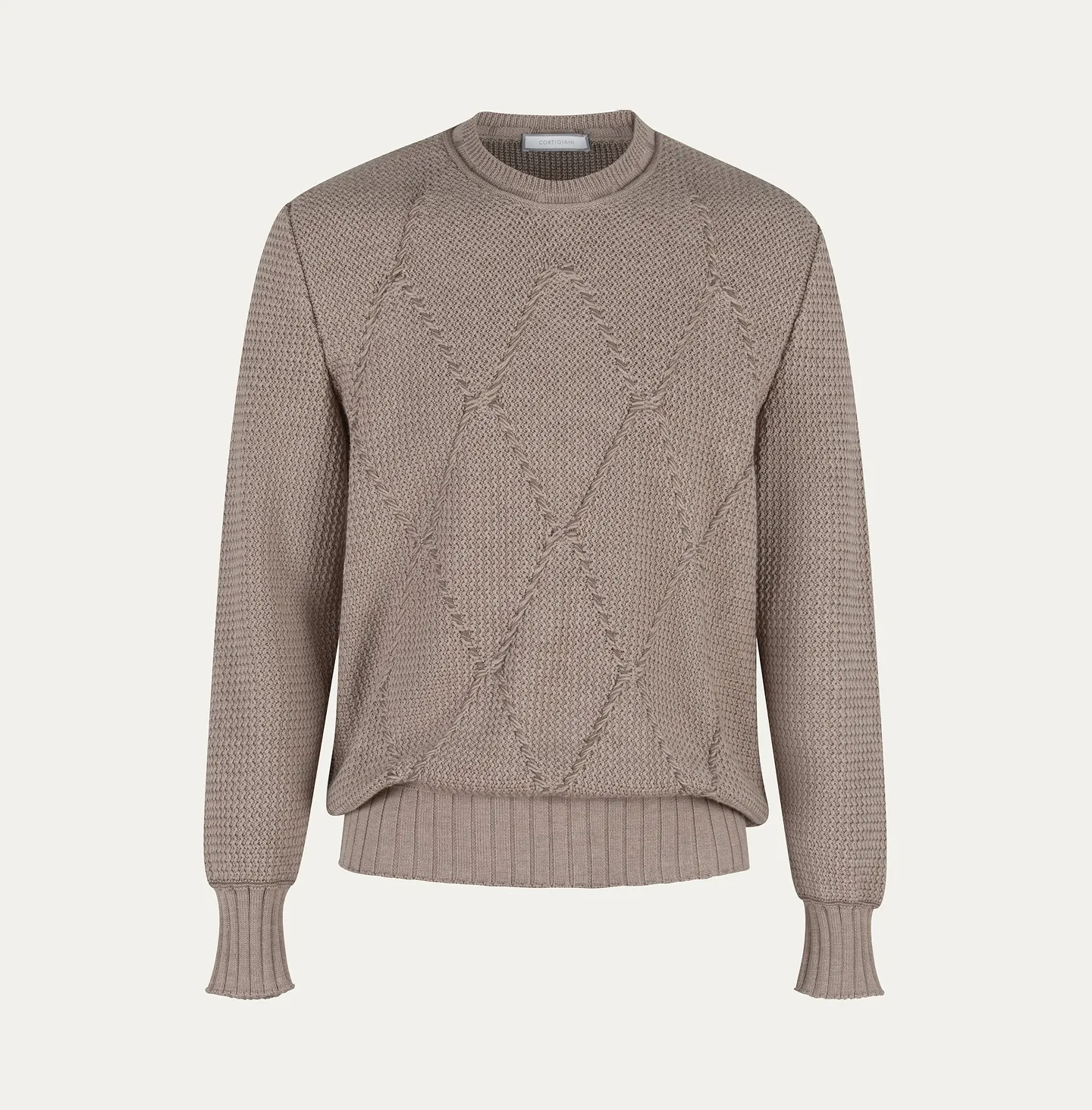 Crew neck sweater crafted from a refined wool and cashmere yarn, combining softness and warmth in an elegant piece. The jacquard diamond pattern on the front is paired with a honeycomb structure on the sleeves and back, creating a sophisticated play of textures. Ribbed collar, cuffs, and hem provide comfort and a perfect fit.