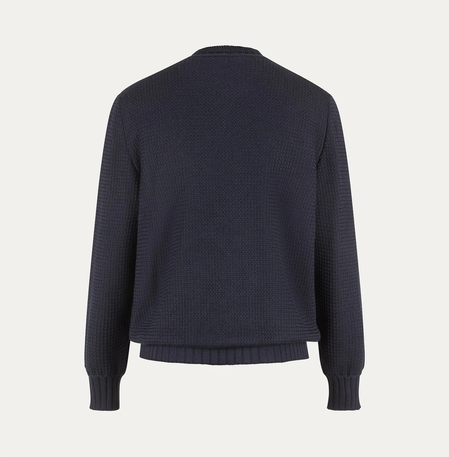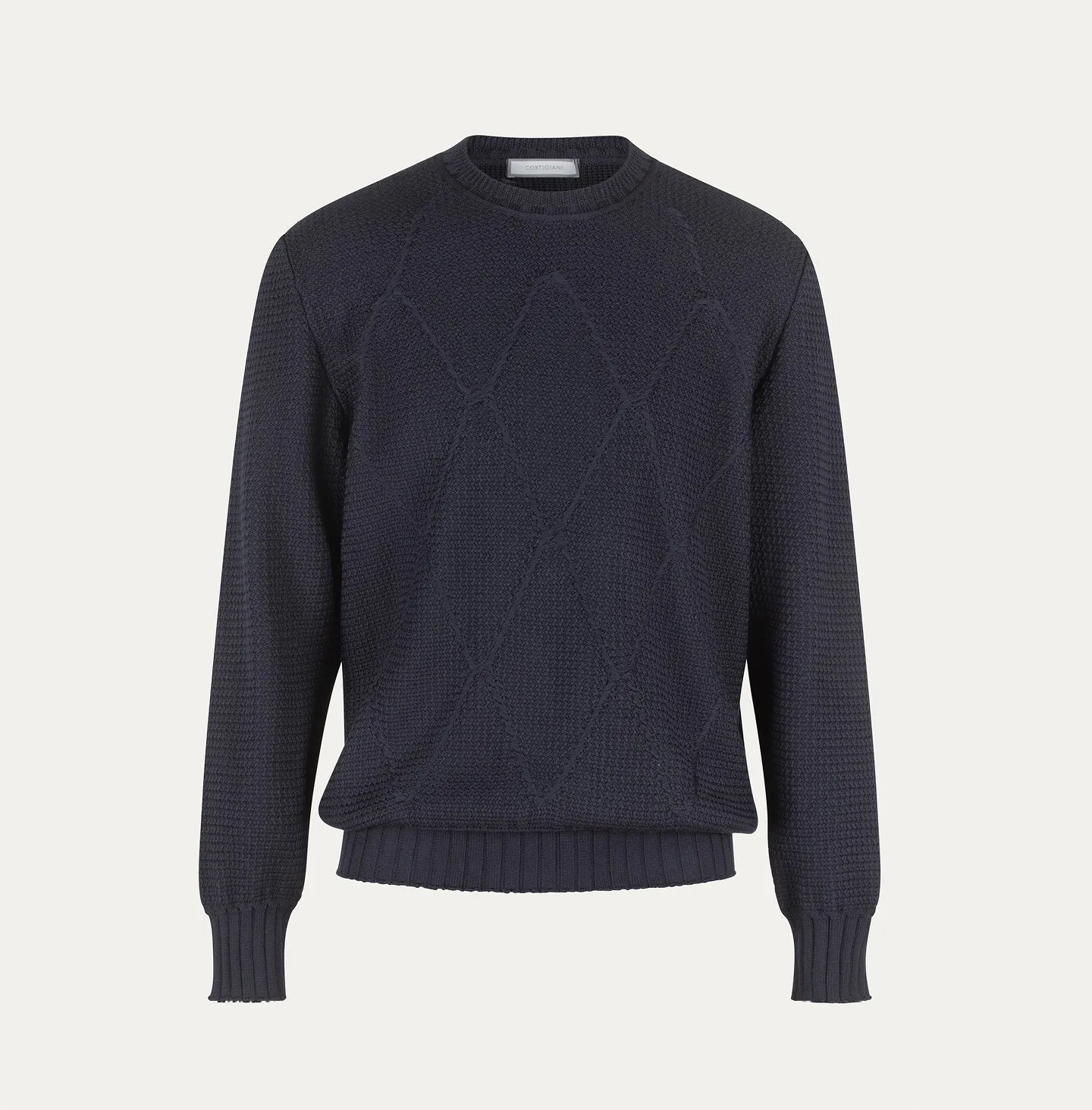 Crew neck sweater crafted from a refined wool and cashmere yarn, combining softness and warmth in an elegant piece. The jacquard diamond pattern on the front is paired with a honeycomb structure on the sleeves and back, creating a sophisticated play of textures. Ribbed collar, cuffs, and hem provide comfort and a perfect fit.