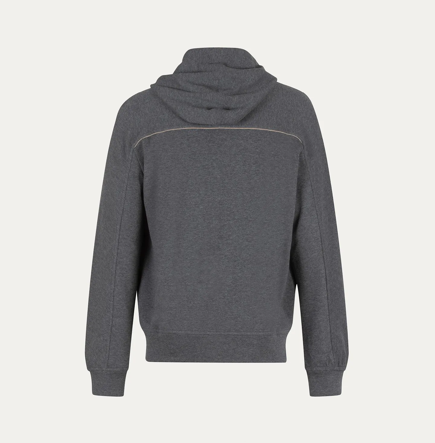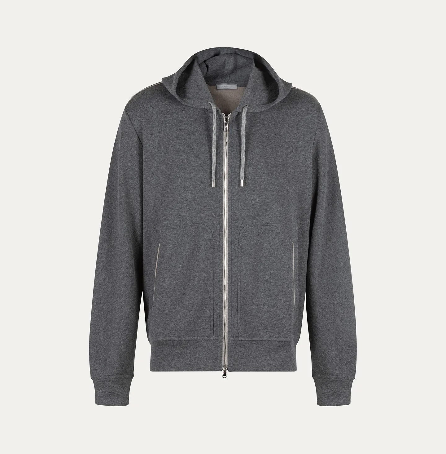 This hooded topwear in cashmere and cotton combines the practicality of a sweatshirt with the refinement of premium materials. The regular fit and clean cut are enhanced by the adjustable drawstring hood and the front double-slider zip, ensuring comfort and versatility. Side welt pockets blend seamlessly into the design, while ribbed cuffs and hem provide a comfortable and functional fit. The stitching detail on the back adds a distinctive and refined touch.
