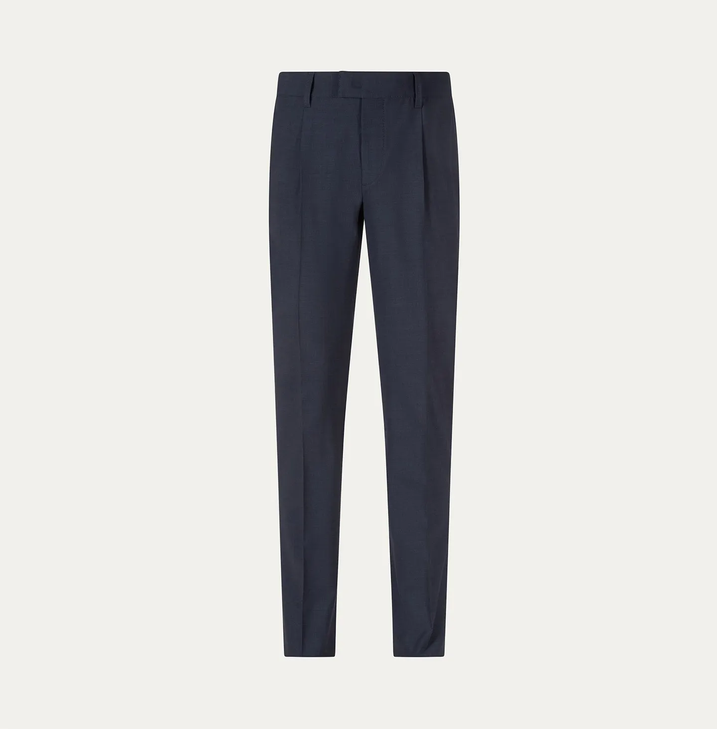 Leisure fit trousers with pleat, featuring a clean and modern silhouette that combines comfort and style. The design includes a waistband with belt loops and an elastic insert at the back, ensuring a comfortable fit while maintaining an elegant look. Slanted side pockets and welt back pockets complete the tailored details of the model.