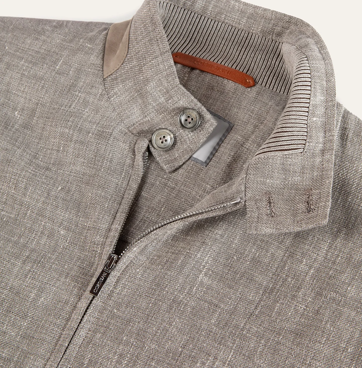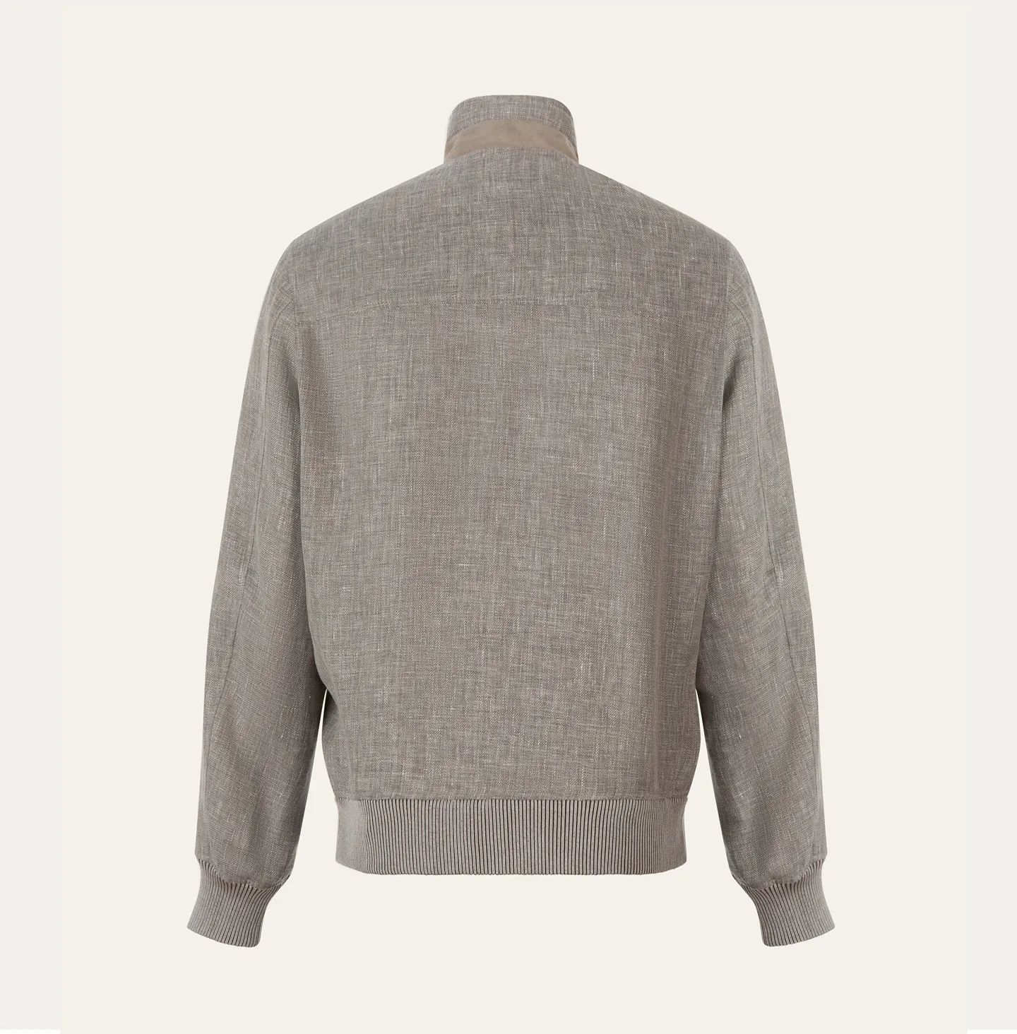 Giubbino sfoderato in lino/lana dal design essenziale e raffinato, pensato per la mezza stagione. Il modello presenta una chiusura frontale con zip e un collo alto strutturato, arricchito da doppio bottone e inserto in maglia a costine all’interno. La linea è pulita e contemporanea, con tasche laterali a filetto che mantengono un’estetica minimale e funzionale. Il capo è completato da finiture in maglia sul fondo e sui polsi, che definiscono la vestibilità e aggiungono comfort. Dettagli in pelle all’interno della tasca e sul collo introducono un accento ricercato e distintivo.