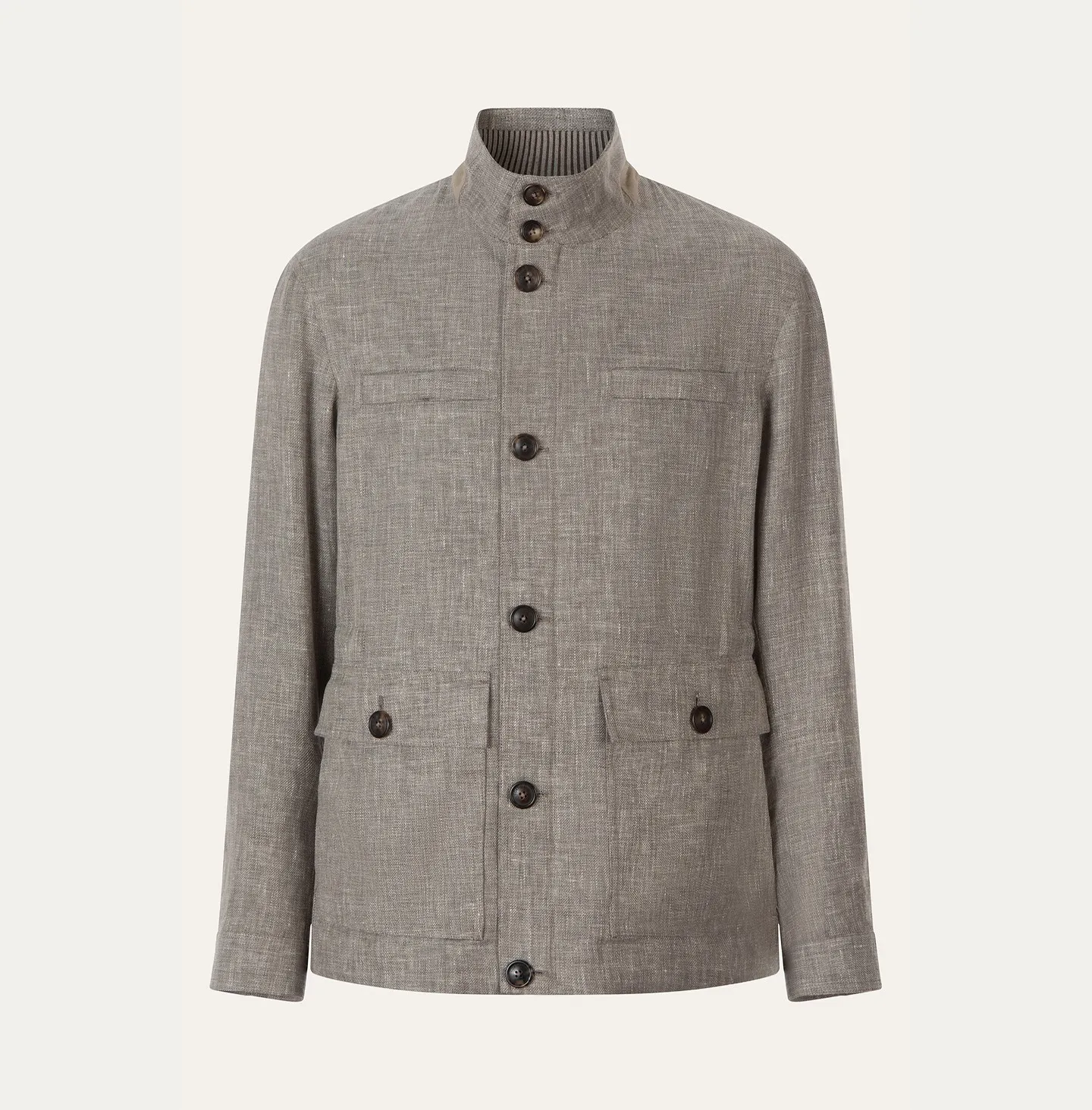 Field jacket in lino e lana dal gusto essenziale e contemporaneo, pensata per accompagnare con eleganza i look di stagione. Il design è caratterizzato da collo alto con chiusura a bottoni, chiusura frontale con zip nascosta e abbottonatura, e tasche applicate sul davanti che richiamano la funzionalità tipica dell’outerwear classico. La linea è pulita e bilanciata, con dettagli curati e finiture precise che valorizzano la struttura del capo.