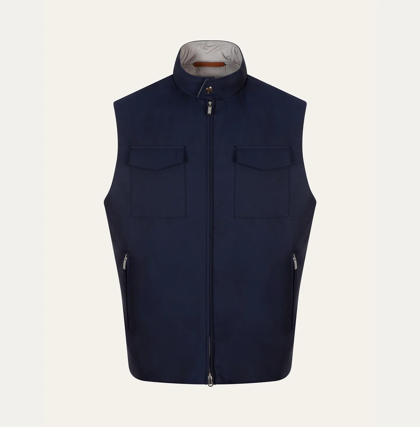 La linea è regolare e leggermente strutturata, con collo alto che protegge e definisce il profilo. La chiusura centrale con zip è completata da un bottone al collo, mentre le tasche laterali con zip garantiscono praticità. Sul davanti spiccano anche due tasche applicate con pattina, ispirate al mondo utility, ma reinterpretate in chiave sofisticata.