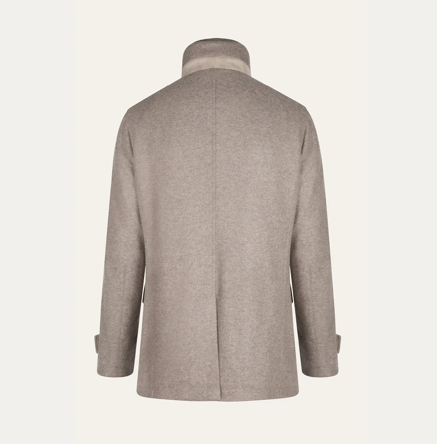 Field jacket dalla linea essenziale, arricchita da un collo in maglia removibile che aggiunge versatilità e comfort. La chiusura frontale presenta quattro bottoni, abbinati a una zip nascosta per garantire una maggiore protezione. Le tasche applicate con patta e bottoni sono dotate di doppio ingresso, frontale e laterale, per un utilizzo pratico e funzionale. Il capo è completato da una tasca sul petto e da martingale regolabili sui polsi.