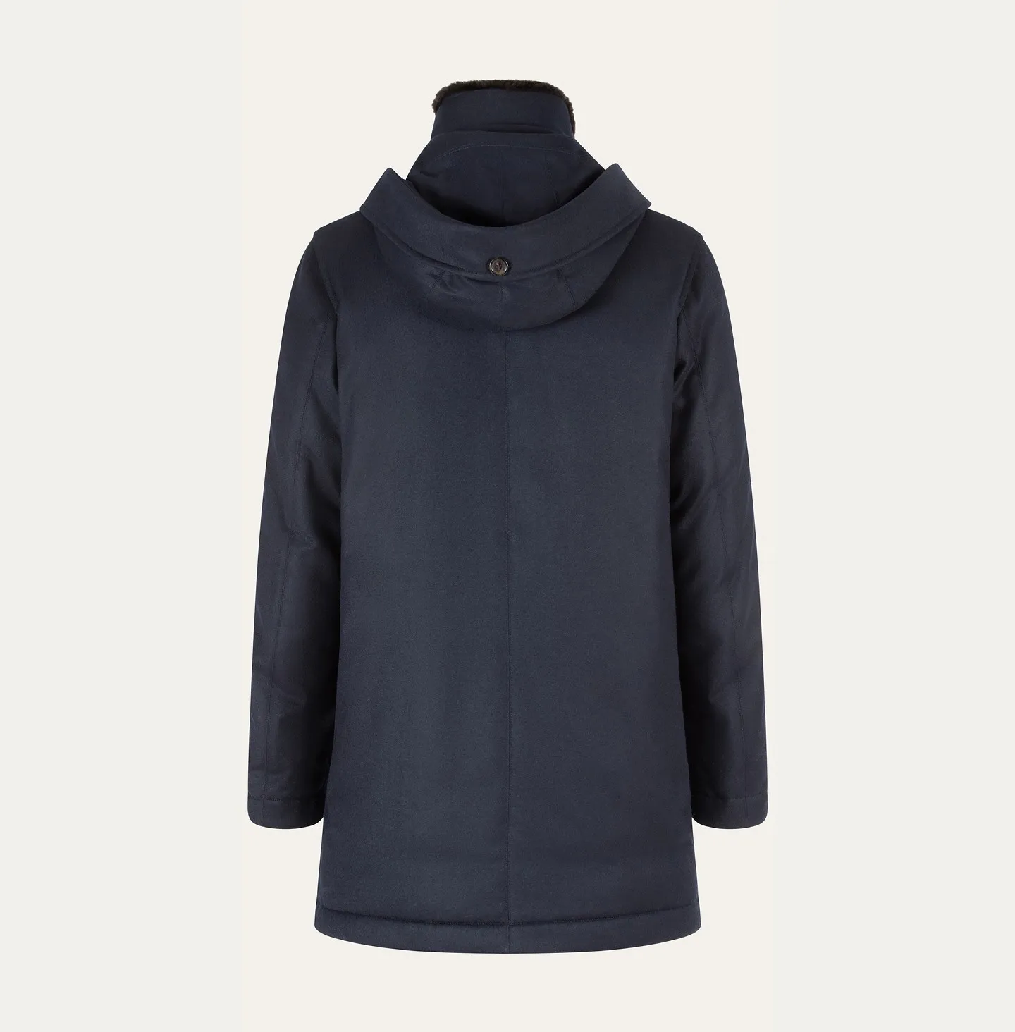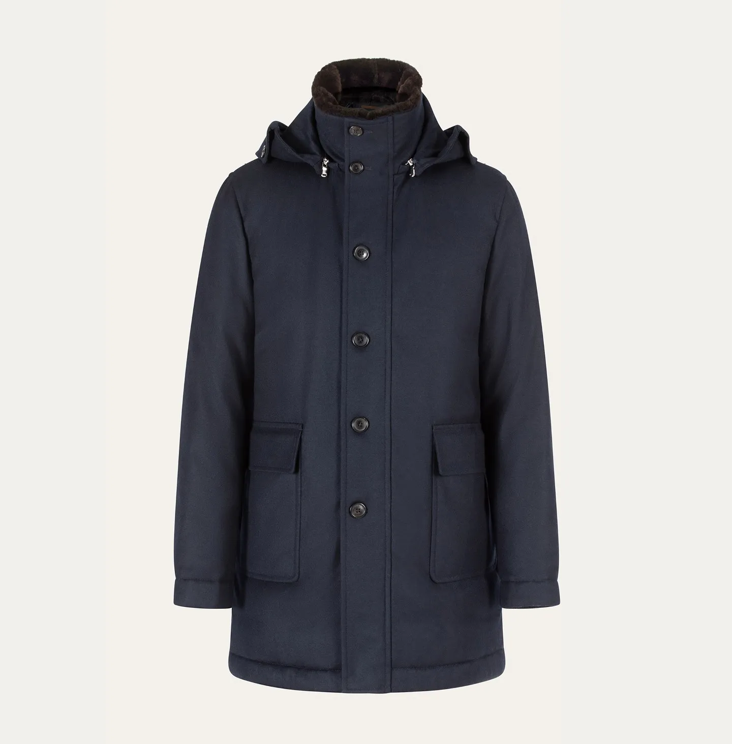 Realizzato in flanella di cashmere, questo parka si distingue per la sua morbidezza e la texture calda e confortevole. L’interno è imbottito in piumino d’oca, che garantisce leggerezza e isolamento termico ottimale. La qualità dei materiali e l’attenzione ai dettagli riflettono la maestria artigianale del capo, pensato per chi desidera un outerwear elegante e funzionale.