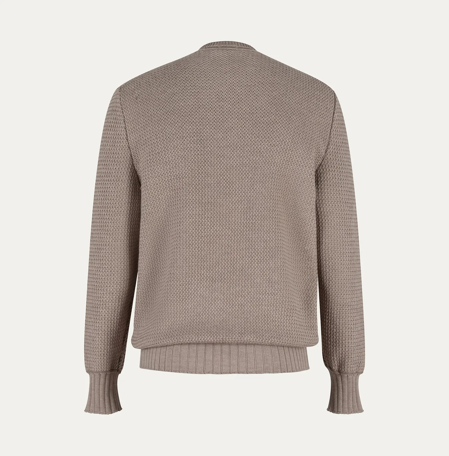 Maglia girocollo realizzata in un pregiato filato di lana e cashmere, che unisce morbidezza e calore in un capo di raffinata eleganza. La lavorazione jacquard a rombi sul davanti si accompagna a una struttura a nido d’ape sulle maniche e sul retro, creando un raffinato gioco di texture. Collo, polsini e fondo a costine garantiscono comfort e una perfetta vestibilità.