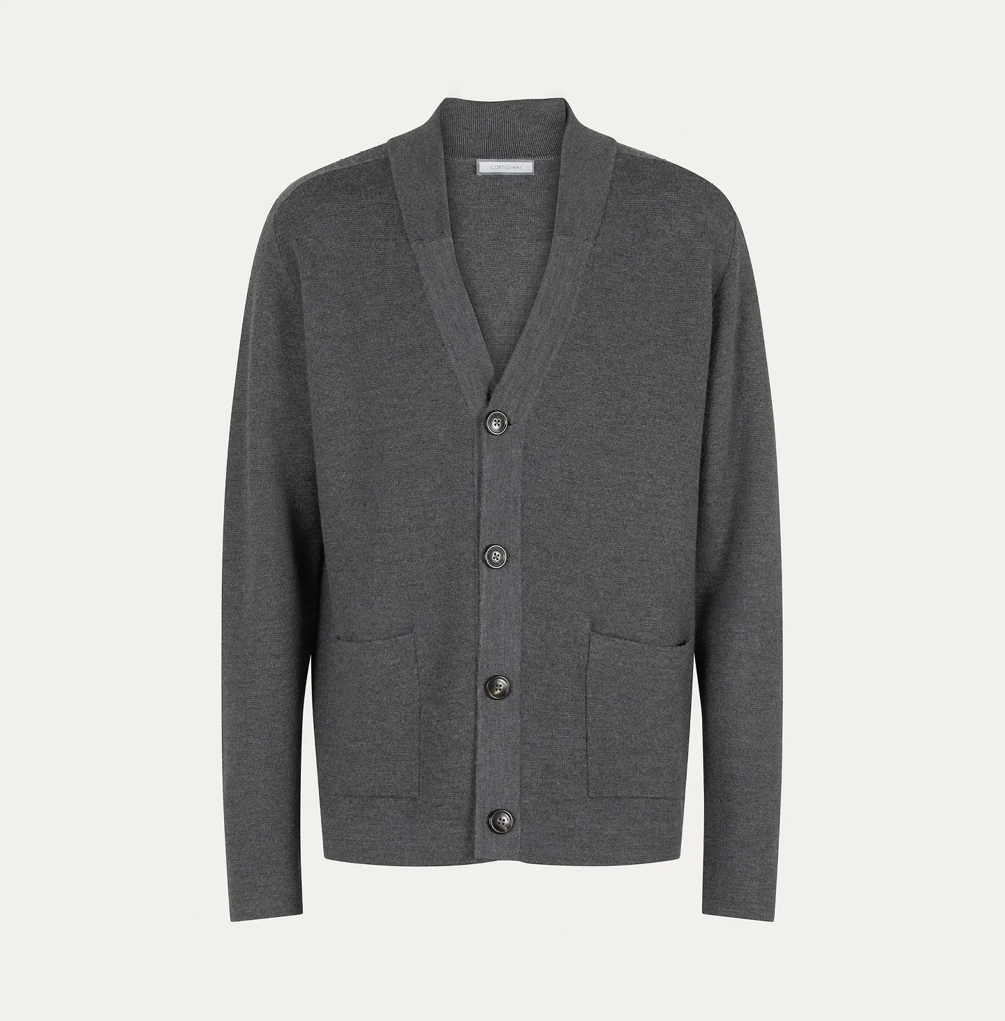 Questo cardigan a scollo a V con chiusura a quattro bottoni reinterpreta un classico del guardaroba maschile in chiave raffinata e contemporanea. Le linee essenziali si arricchiscono di due tasche applicate sul davanti, che uniscono funzionalità e discrezione. Il taglio regolare assicura comfort e libertà di movimento, mentre il bordo in maglia sul fondo e i polsini semplici definiscono la struttura del capo con equilibrio e sobrietà. Un modello versatile, pensato per accompagnare con naturalezza sia look casual che combinazioni più formali.