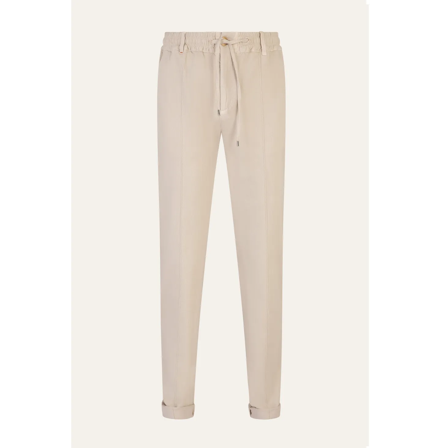 Pantaloni con coulisse dallo spirito rilassato e contemporaneo, pensati per un’eleganza informale ma curata. La vita elasticizzata con coulisse regolabile assicura comfort e vestibilità versatile, mentre la linea asciutta e leggermente affusolata valorizza la silhouette. Presentano tasche laterali e tasche posteriori applicate, con fondo risvoltato che aggiunge un dettaglio distintivo e moderno. La tintura in capo dona profondità cromatica e un aspetto leggermente vissuto, esaltando il carattere autentico del modello.