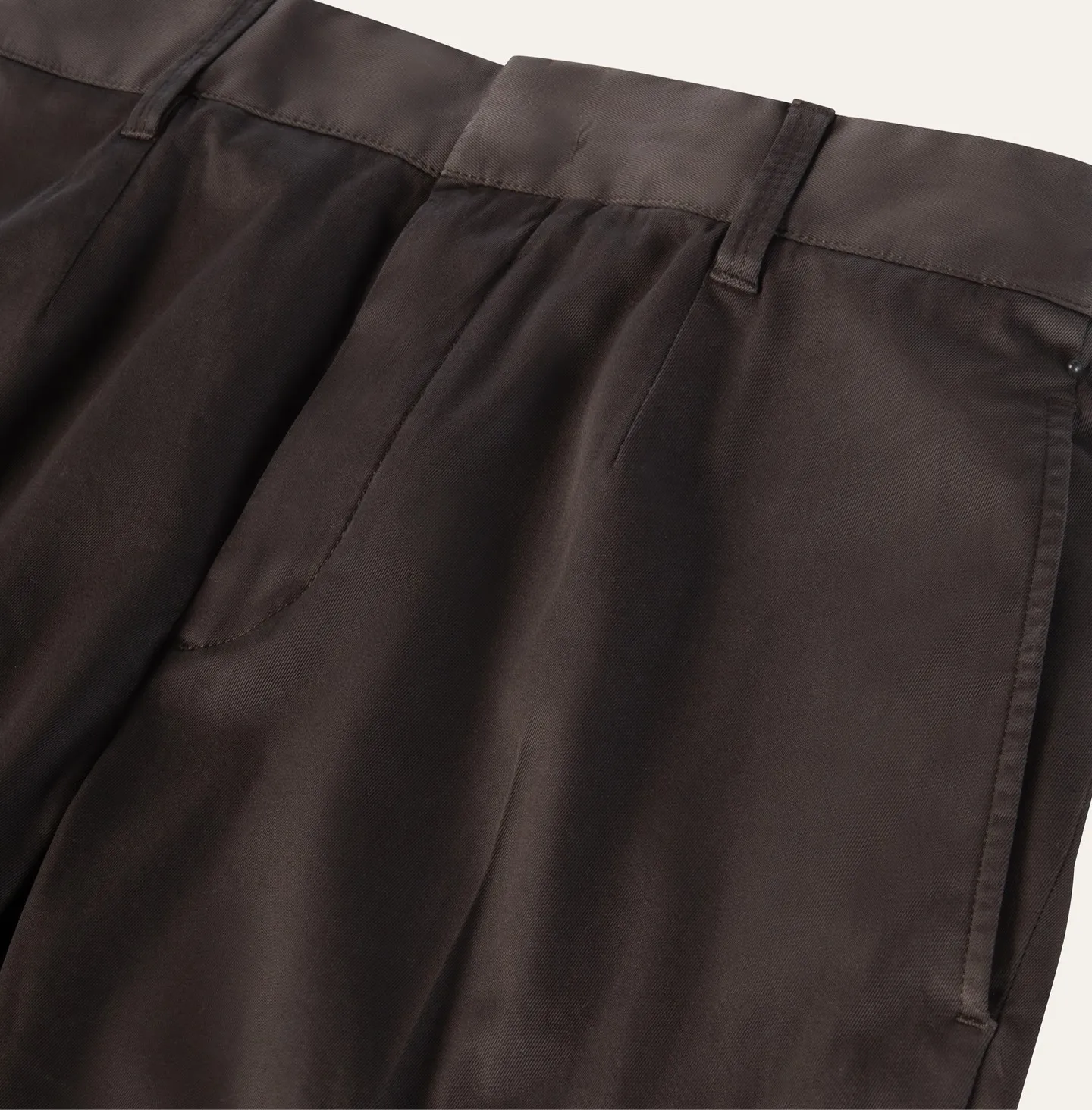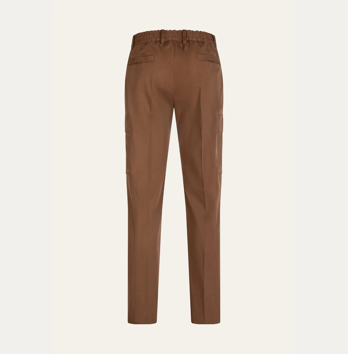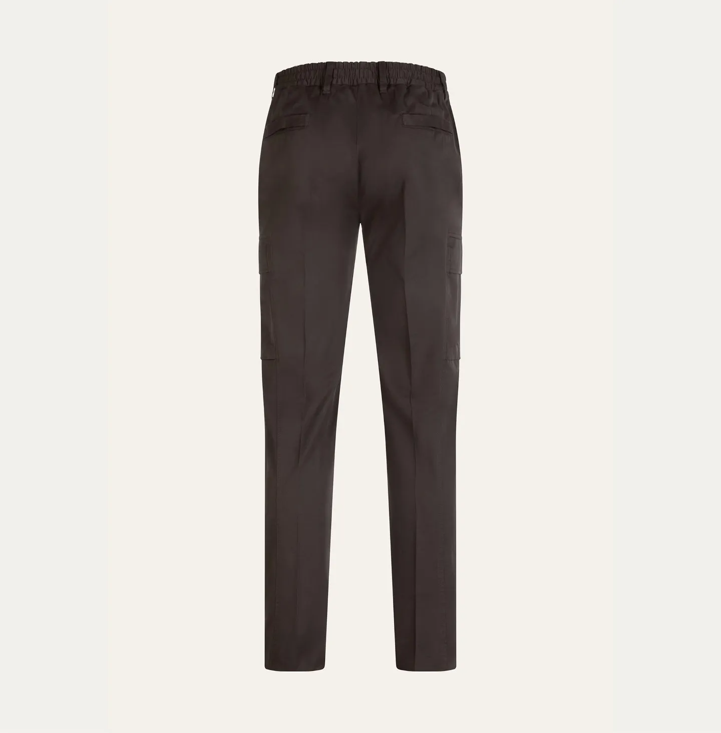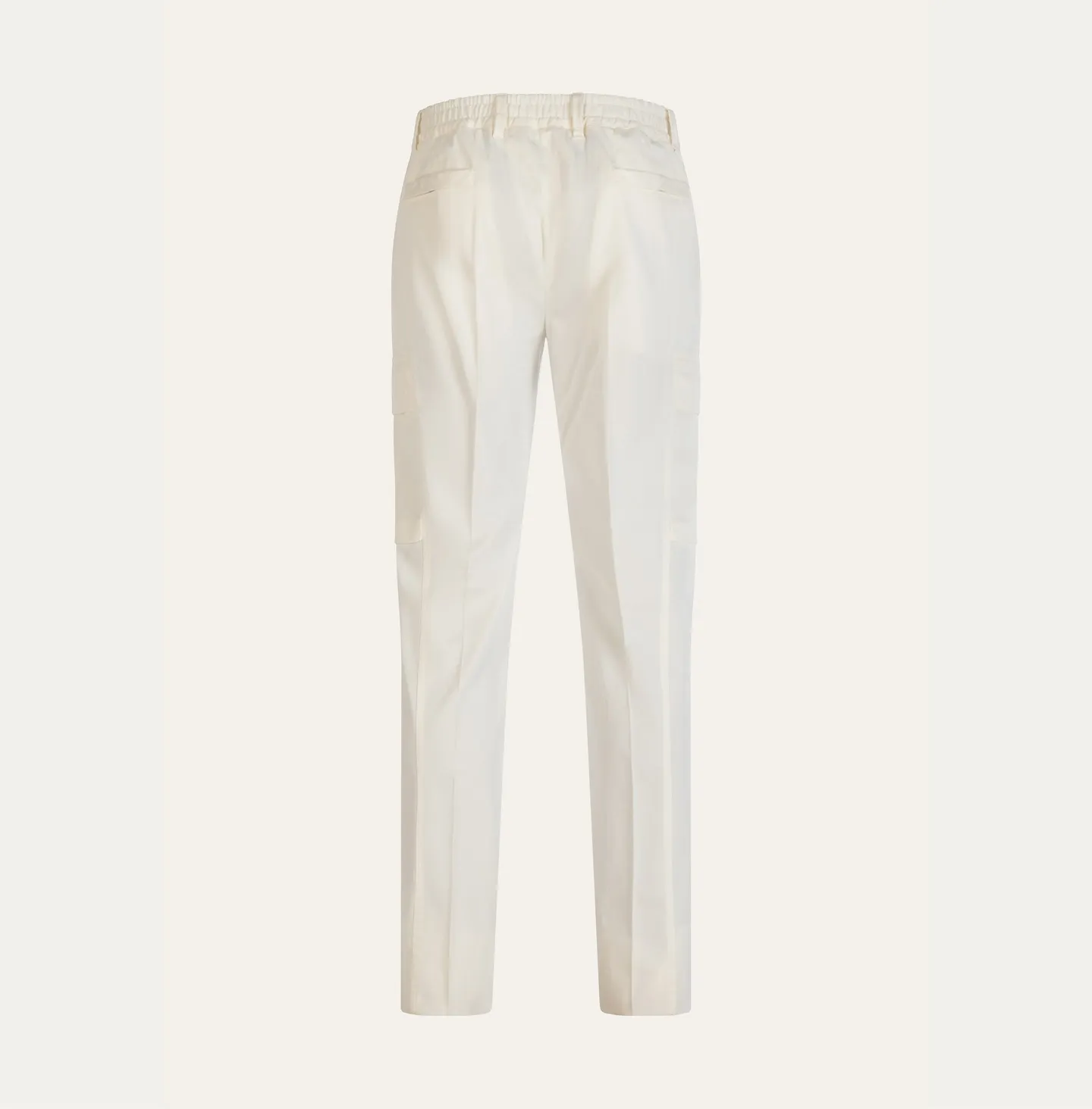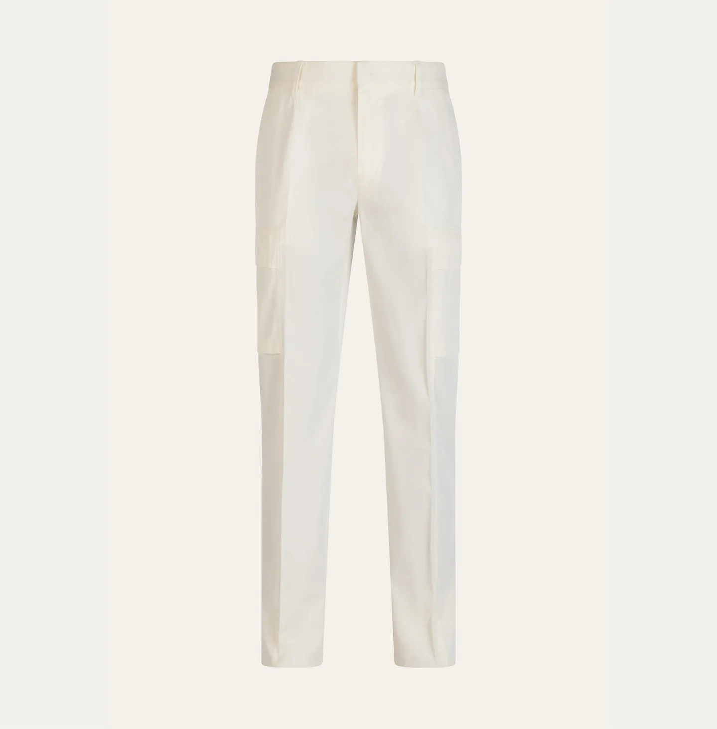Pantalone cargo rivisitato in chiave contemporanea, caratterizzato da una linea pulita e da un’estetica essenziale che reinterpreta il classico modello utility con un approccio più raffinato. Il design presenta vita con passanti per cintura ed elastico sul retro, che garantisce comfort e una vestibilità più flessibile mantenendo al tempo stesso un aspetto ordinato. Le tasche laterali oblique e le tasche posteriori a filetto completano la costruzione del capo. Elemento distintivo del modello sono i tasconi laterali con pattina inserita nelle cuciture, un dettaglio discreto che integra la funzionalità del cargo in modo elegante e minimale, mantenendo la silhouette asciutta e contemporanea.