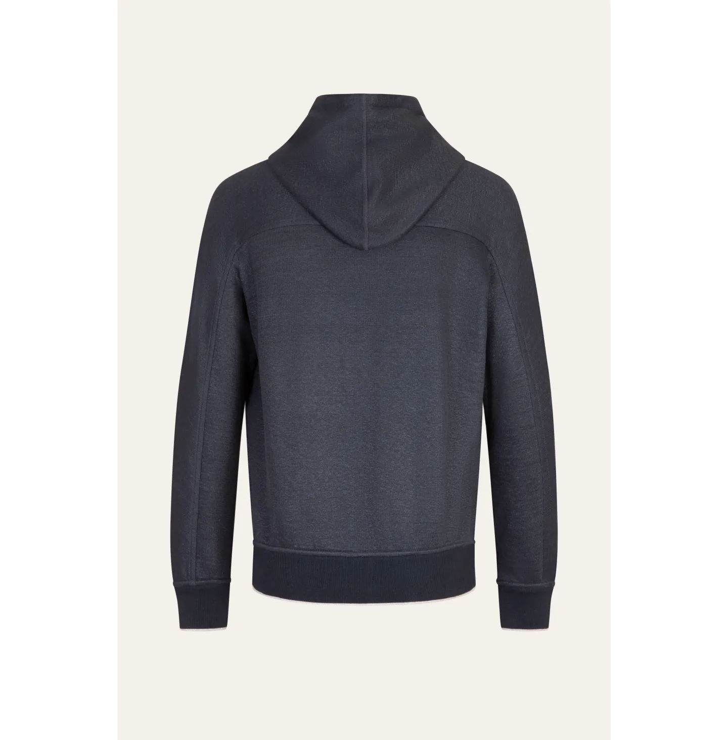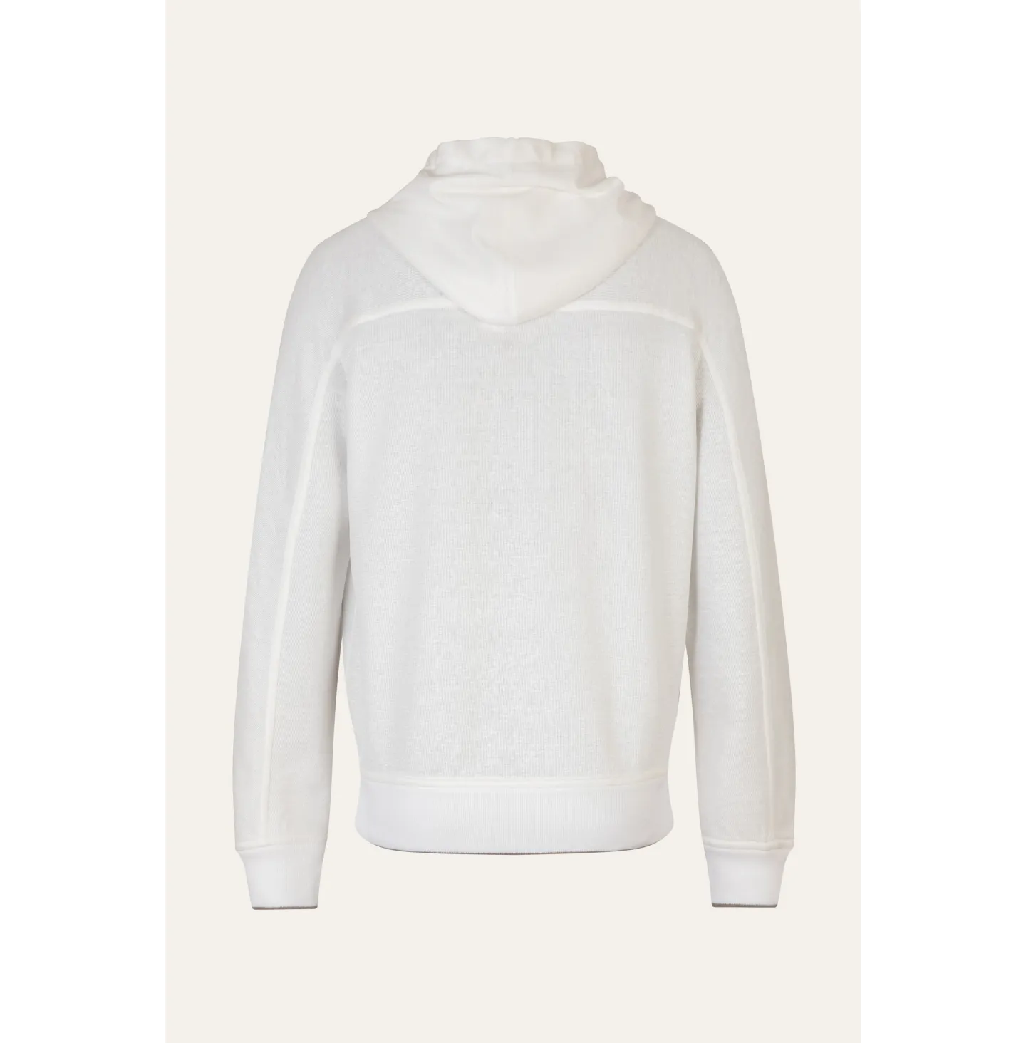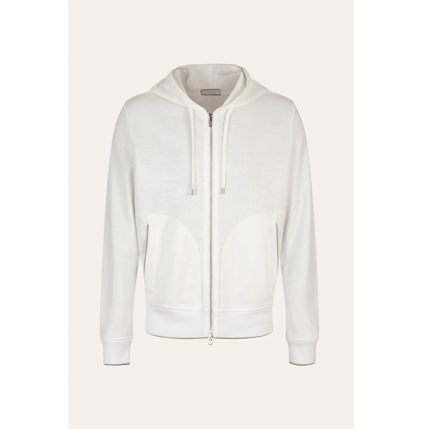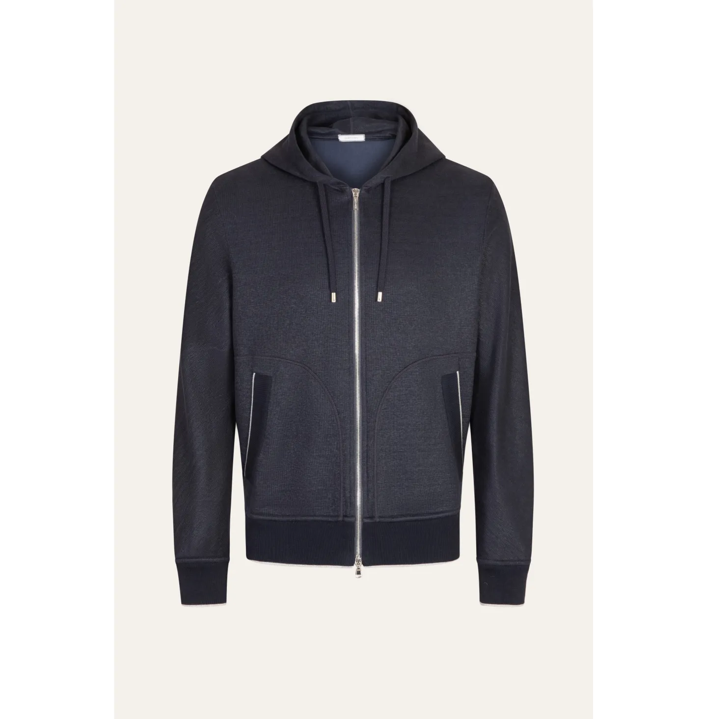 Topwear con cappuccio dallo spirito contemporaneo e rilassato, pensato per un’eleganza informale ma ricercata. Il modello presenta chiusura frontale con zip a doppio cursore, cappuccio regolabile con coulisse e tasche laterali inserite con profilo definito. Le maniche lunghe con costruzione morbida garantiscono comfort e libertà di movimento, mentre fondo e polsi in maglia assicurano una vestibilità equilibrata. Le finiture in maglia sono impreziosite da una riga a contrasto che aggiunge un dettaglio grafico discreto e distintivo.