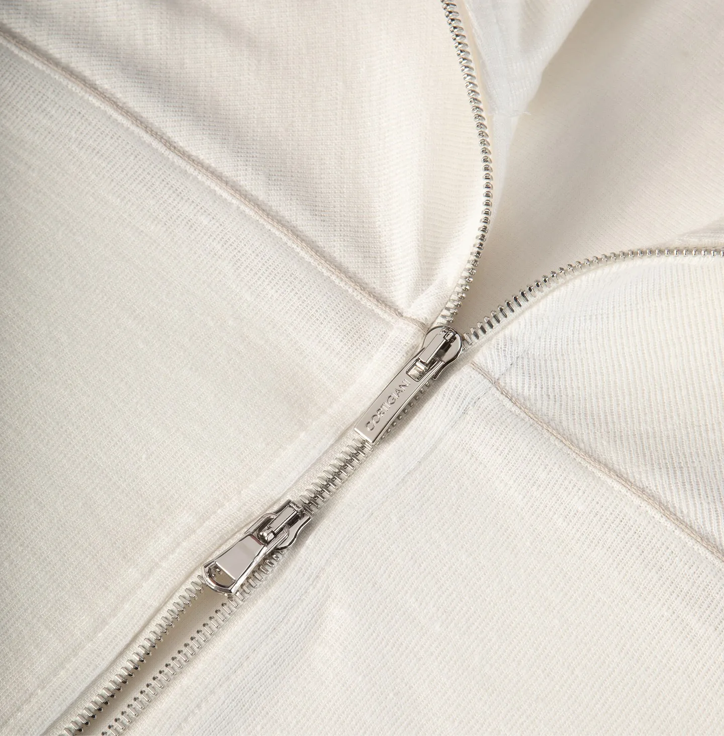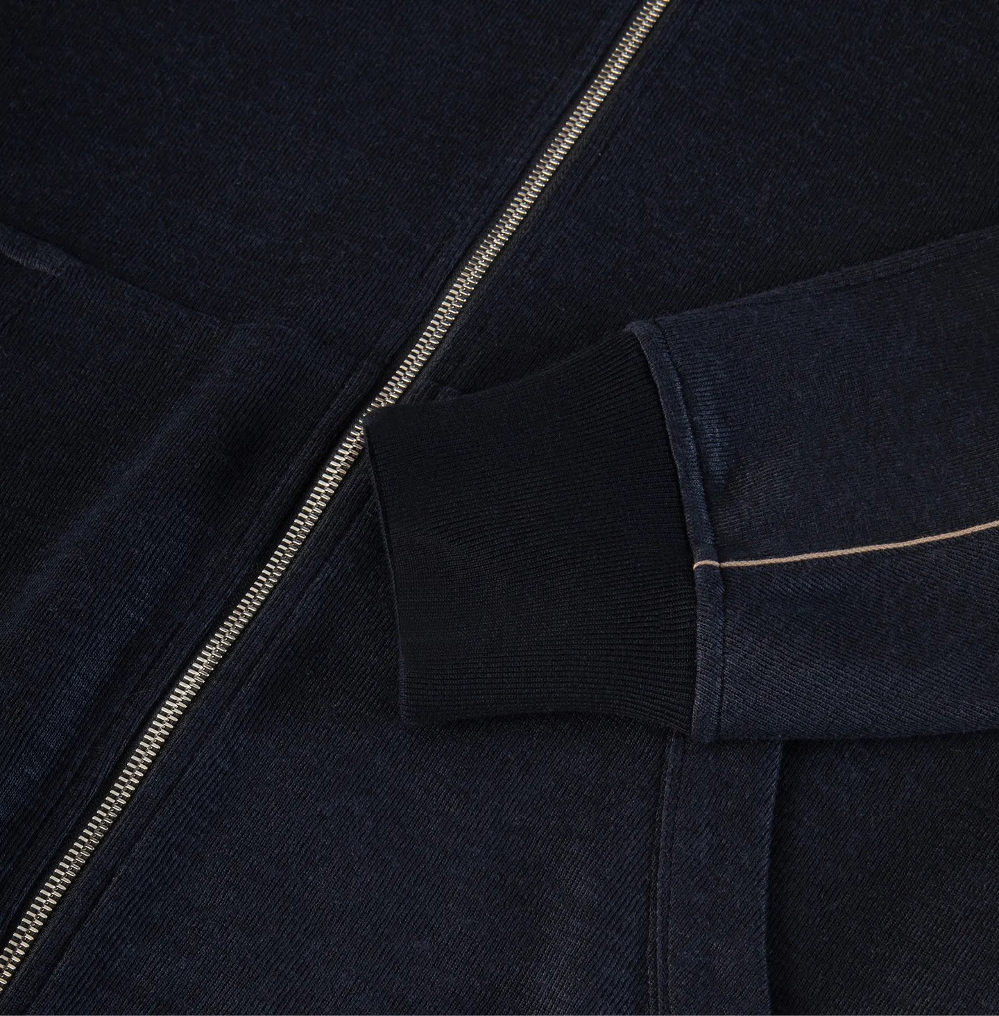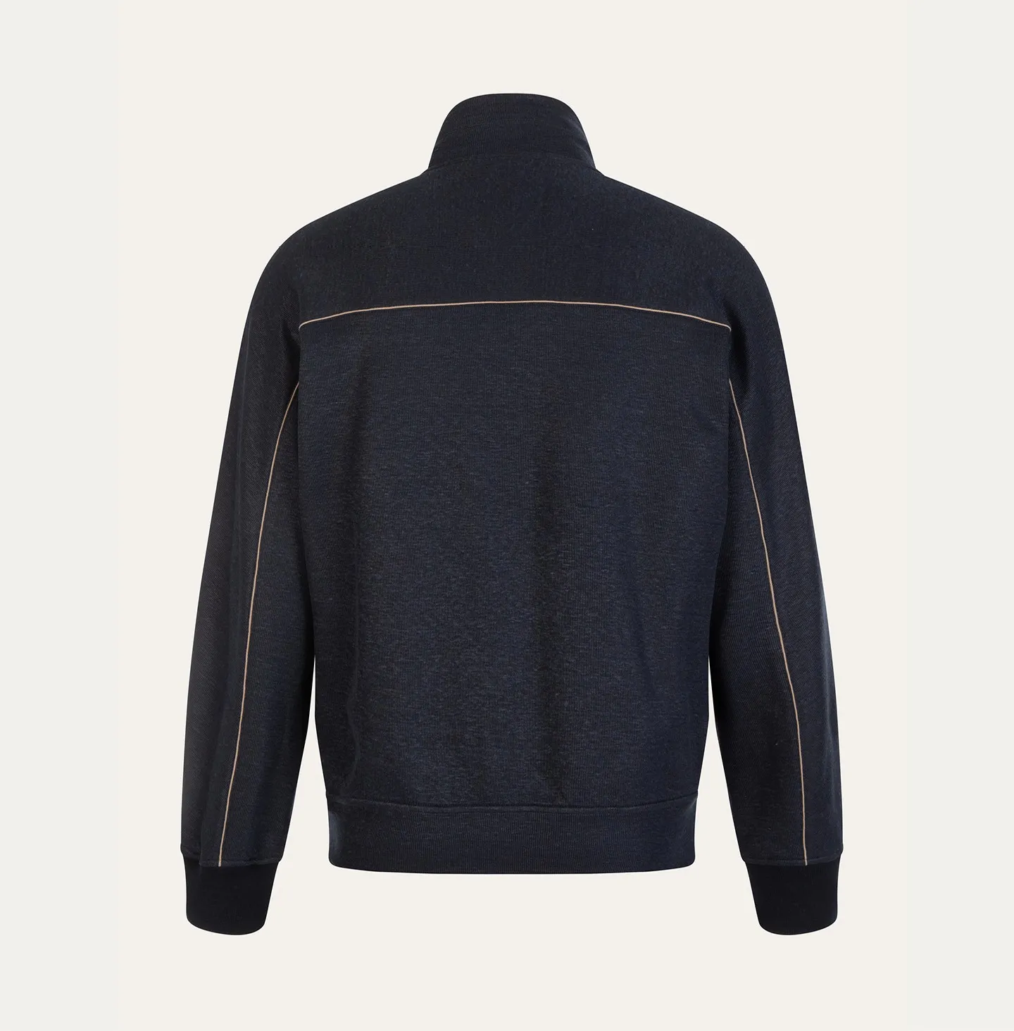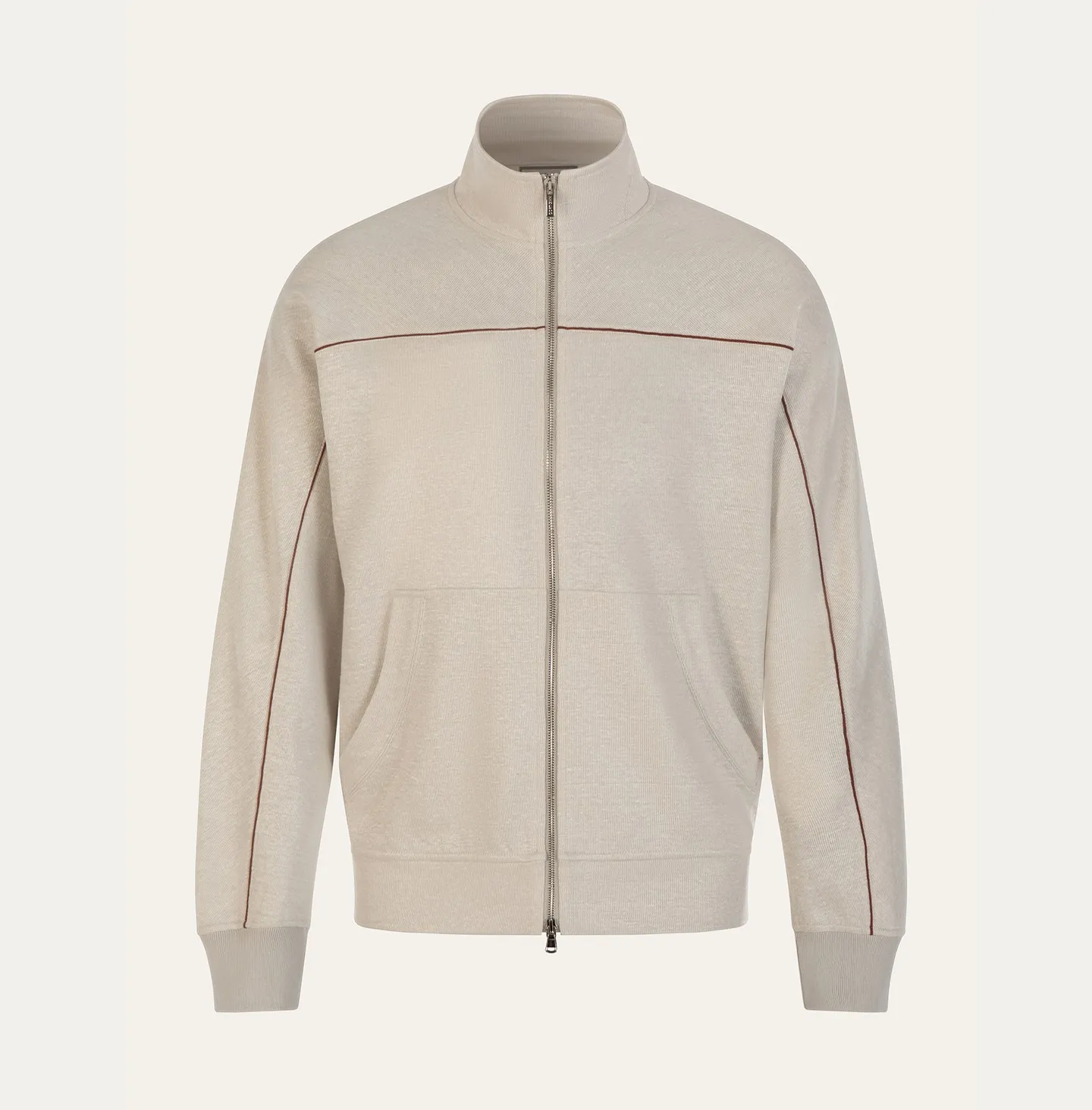 Topwear con zip frontale e collo alto, caratterizzato da un’estetica pulita e contemporanea che unisce comfort e raffinatezza informale. Il modello presenta una linea essenziale con spalle morbide e fondo e polsi rifiniti a costina, elementi che richiamano il mondo dello sportswear reinterpretato in chiave più sofisticata. La chiusura con zip a doppio cursore e le tasche applicate aggiungono funzionalità e praticità al capo. Un dettaglio distintivo è rappresentato dal piping a contrasto che percorre il petto e le maniche, disegnando una linea grafica sottile che valorizza la costruzione del capo e dona un accento di carattere all’insieme.